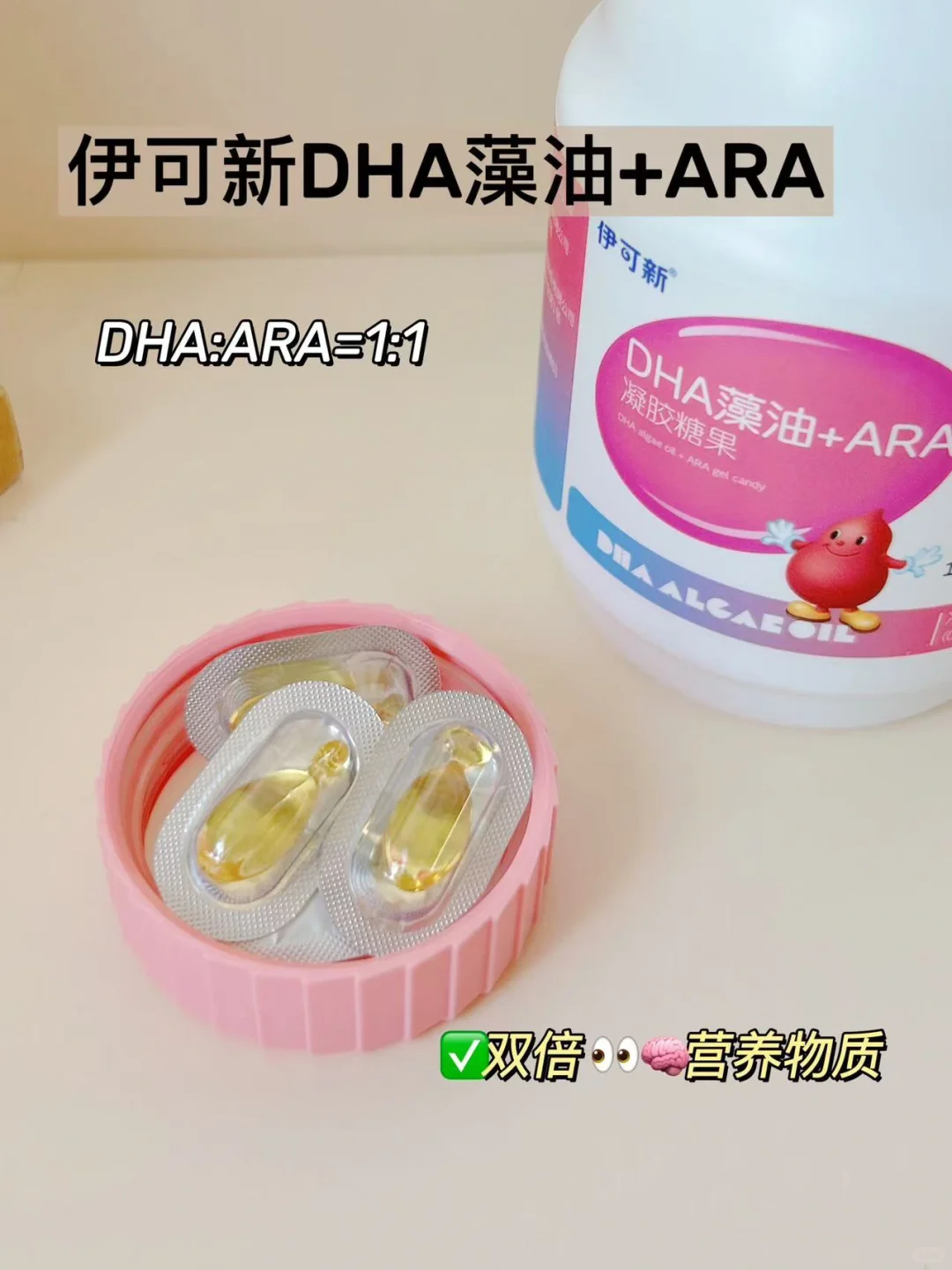 每一颗含DHA110mg,ARA110mg,1:1科学配比,藻油原料来自上市公司嘉必优,也是我选择它的重要因素‼️