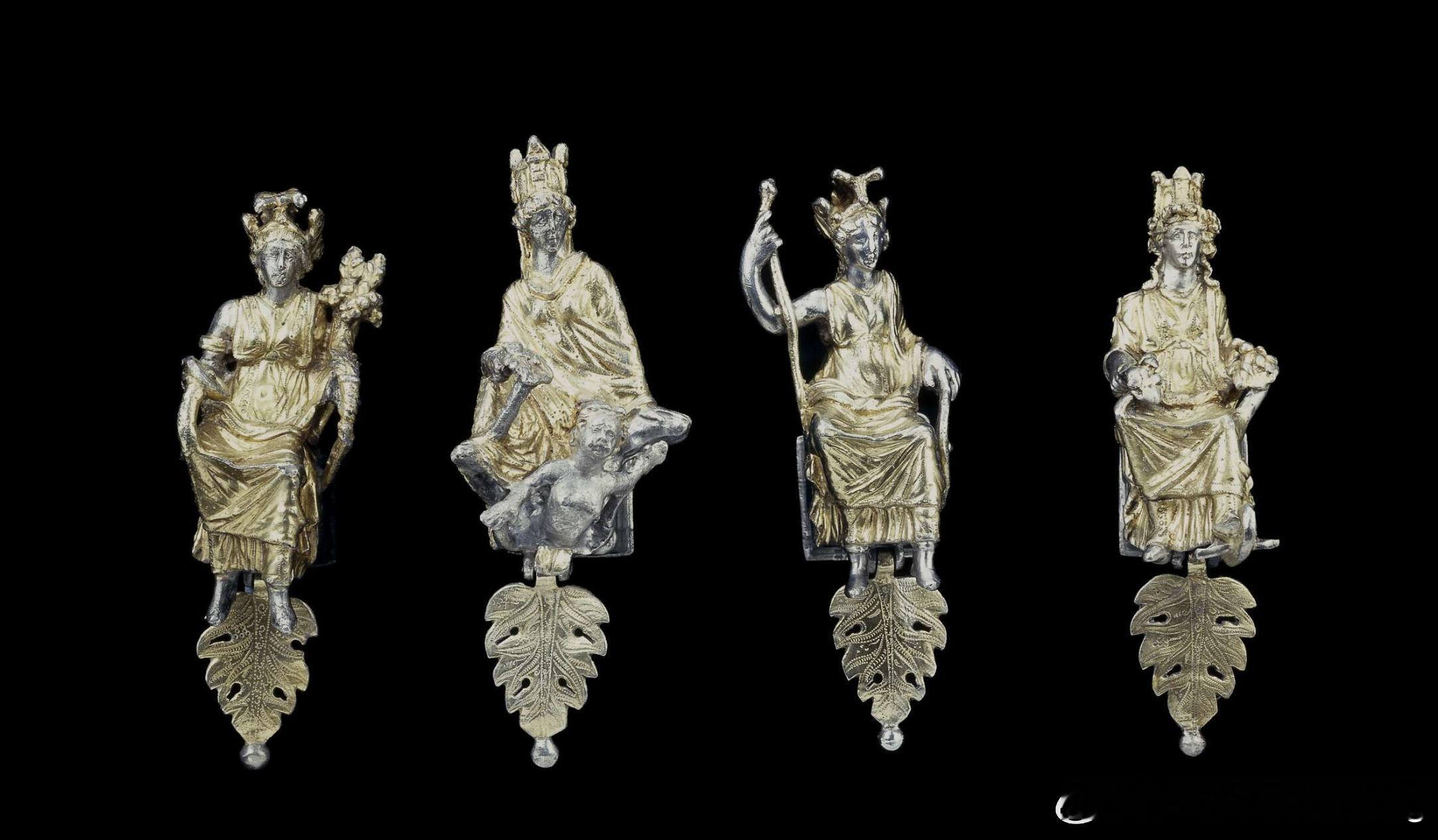 这些装饰物描绘了代表晚期罗马世界 四大城市的女性形象(提凯斯) 。“罗马”身着军装。“君士坦丁堡”手持聚宝盆(装满鲜花和食物),象征着丰收。“亚历山大”手持玉米捆,脚踏船头。最后,“安条克”坐在流浪者奥兰特斯上方的岩石上,下方是裸体青年。于公元 1793 年在意大利罗马埃斯奎林山脚下发现。制作时间:约公元 380 年。