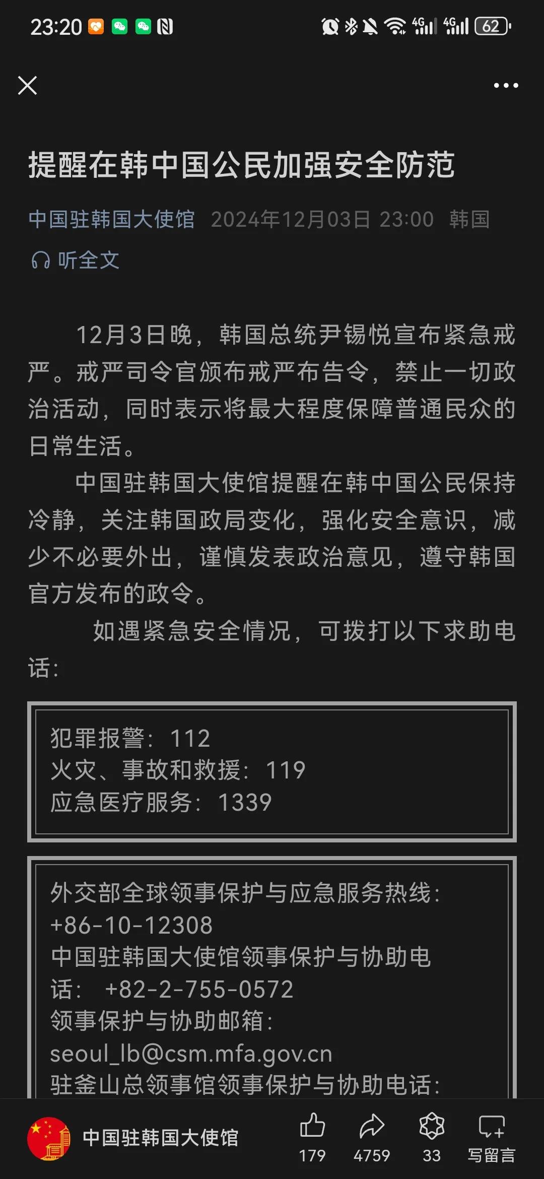 尹锡悦总统韩国宣布实施“紧急戒严”,驻韩使馆提醒华侨保持冷静,密切关注[笑哭]