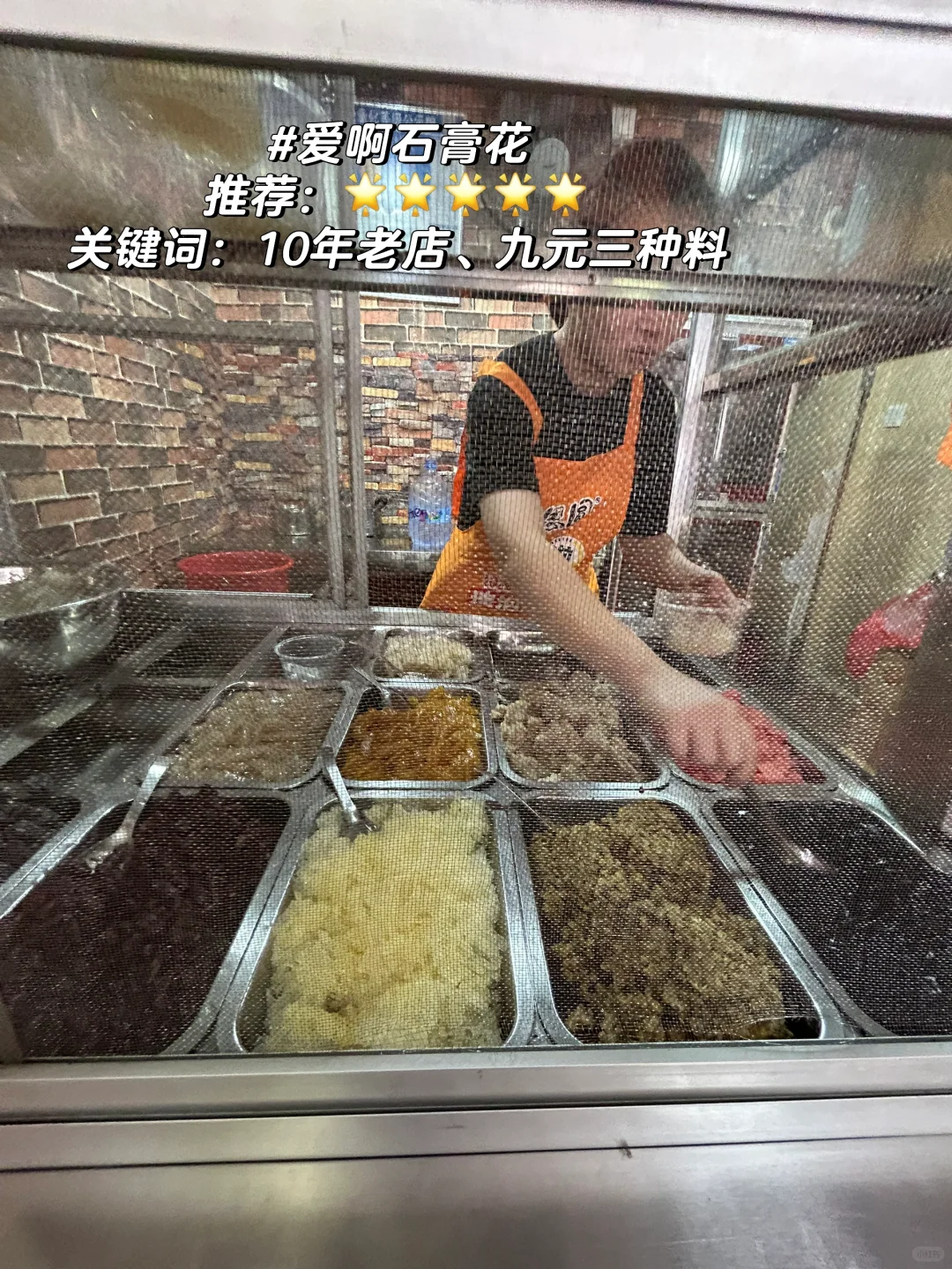 6. 爱啊石膏花 在前往清净寺的路上偶遇这家店,这名字起的也太特别了 黄色大字评分3.8,收录10年的老店 9块钱来一份石花膏+芋泥+龟苓膏的小糖水,犒劳下一路暴走没有打车的自己哈哈哈,推荐🌟🌟🌟🌟🌟