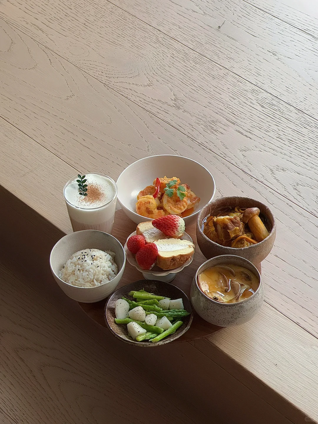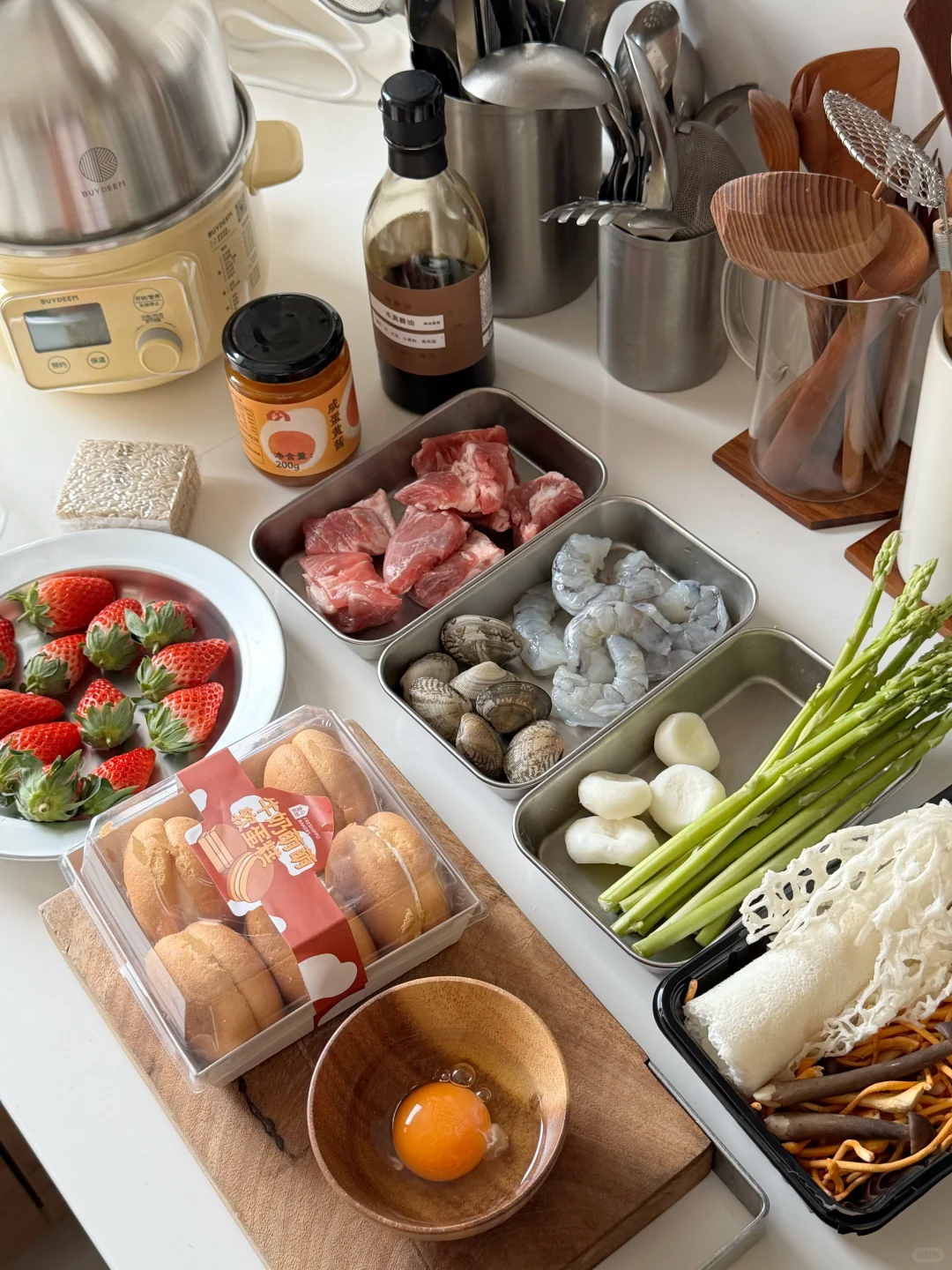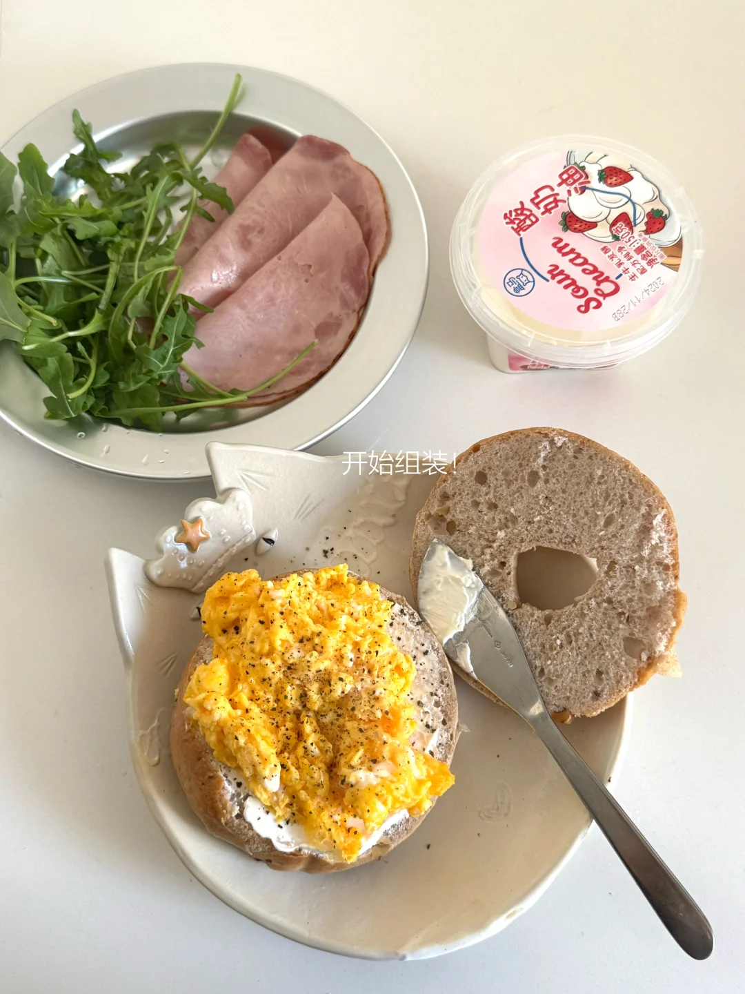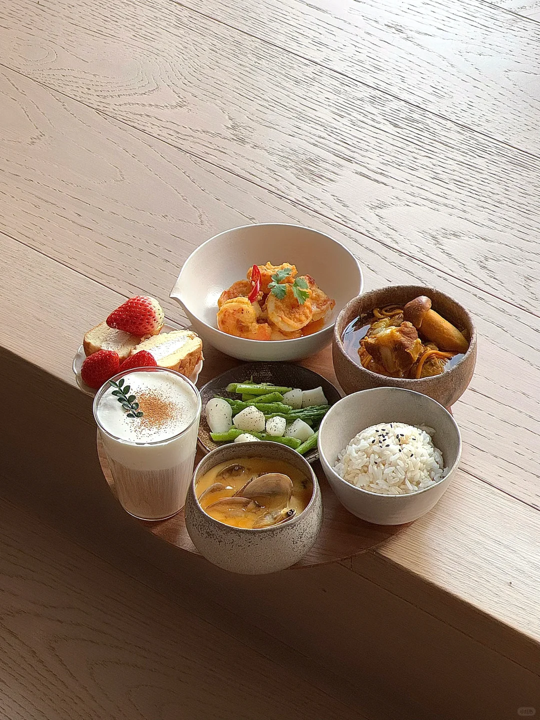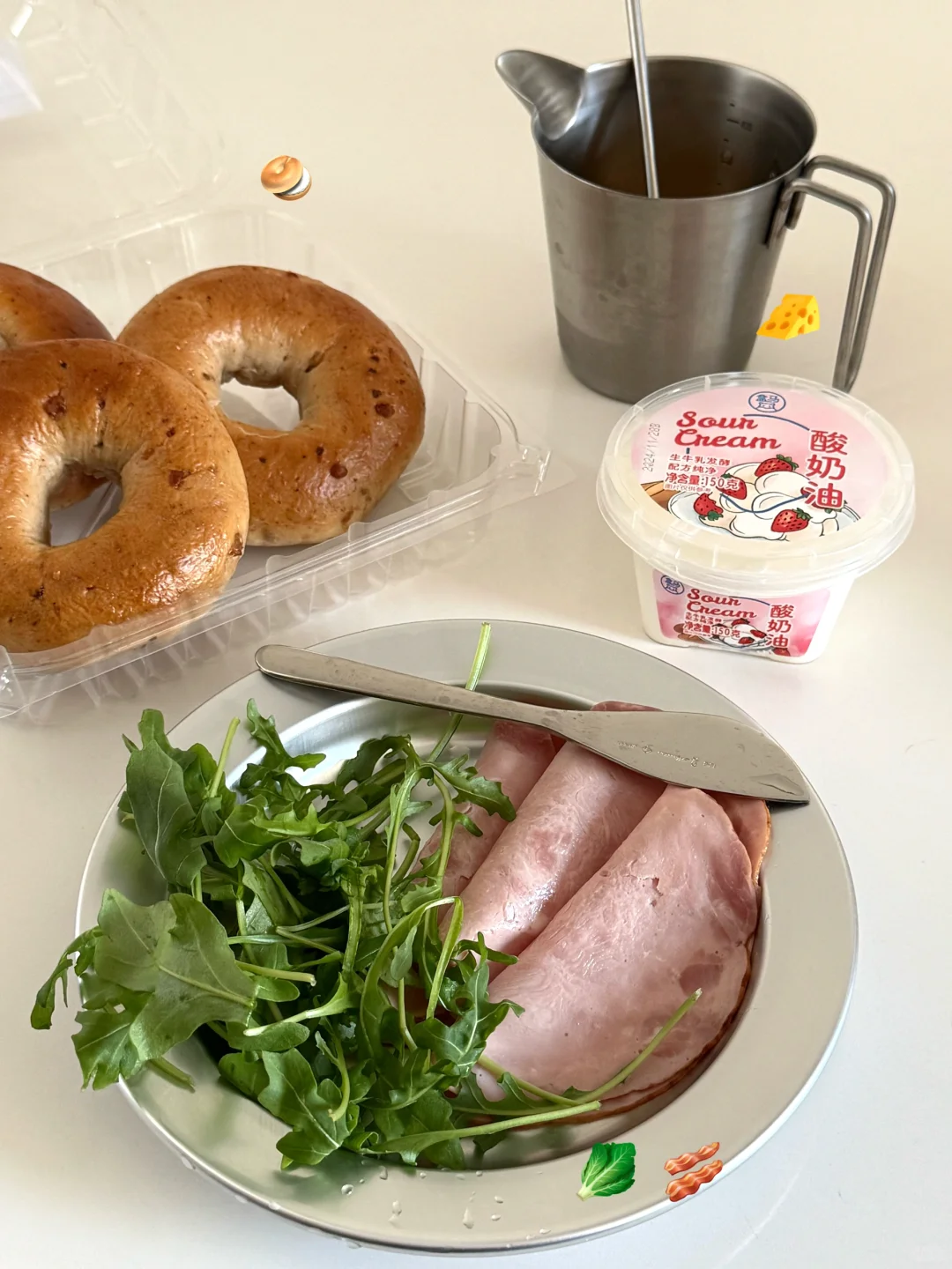 - 周末的一日三餐 午餐📝 咸蛋黄虾仁🍤做法附图 排骨虫草花汤🍄🟫做法附图 蛤蜊蒸蛋🦪做法附图 马蹄炒芦笋🎋 红茶奶盖🥛 燕麦米饭🍚 草莓+蛋糕🍓 - 早餐🥣 贝果+酸奶油+芝麻菜+滑蛋+熏鸡肉🥯🥓🥬🧀 有肉有菜有碳水 贝果里有核桃 四舍五入坚果吃啦! 所有食材准备好 十分钟就能吃上美味早餐🥯 - 晚餐🥩 板腱牛排+唐辛子+山椒粉+芝麻盐🫙 眼肉太肥 西冷太老 板腱正正好 7分熟 完美·.·