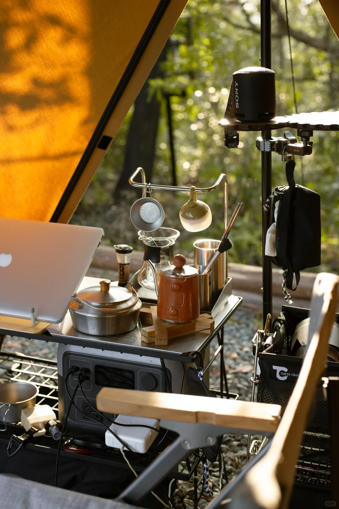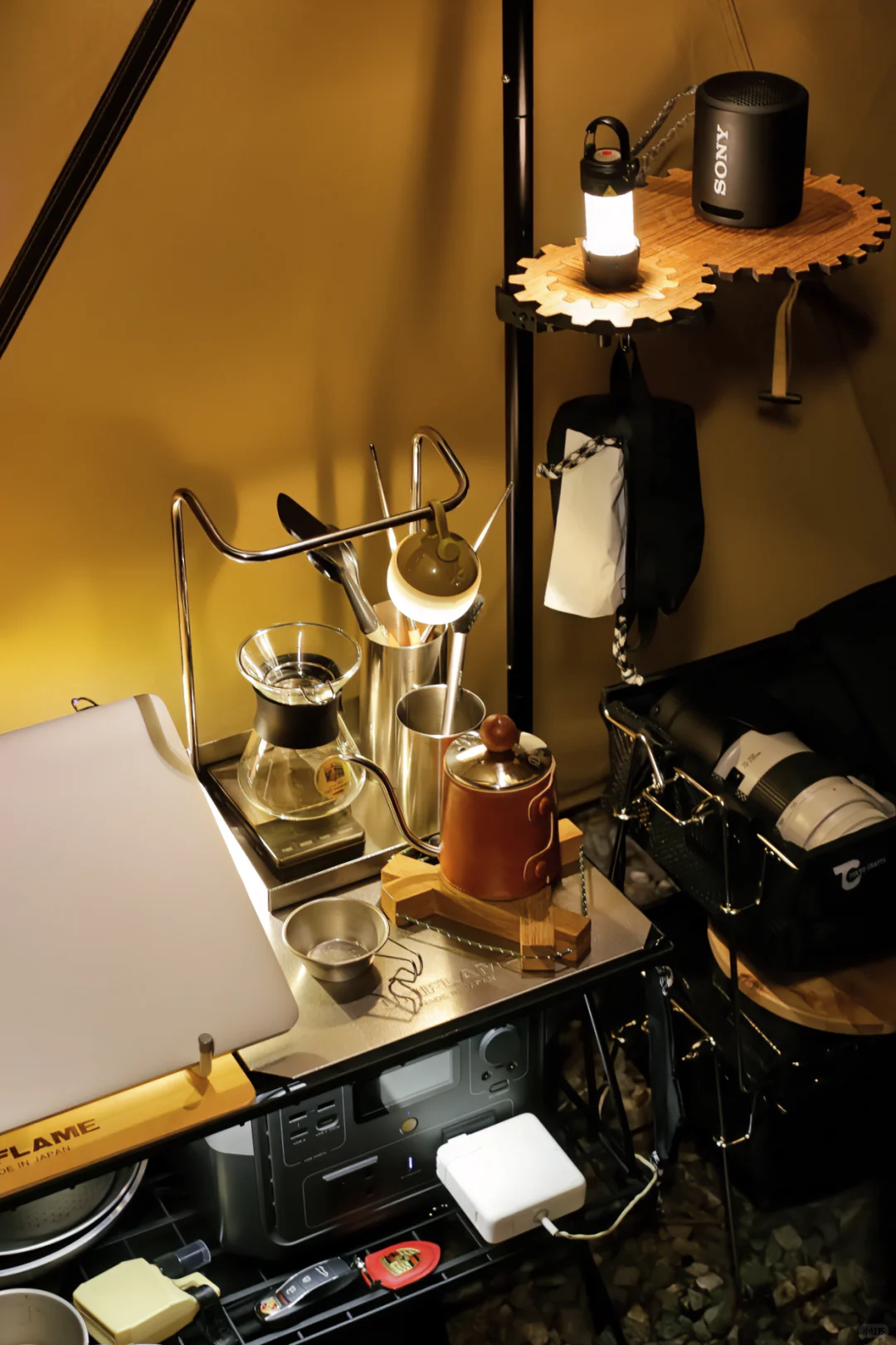 [向右R]收纳:网桌旁边是Tokyo Crafts家的双层网兜,可以视作一个轻量级双层开口箱的用途,这次所有的咖啡餐厨具都是用它装来营地的,到了营地把餐厨具拿出来后,就用来收纳杂物,晚上还可以用来放洗漱用品和衣物。