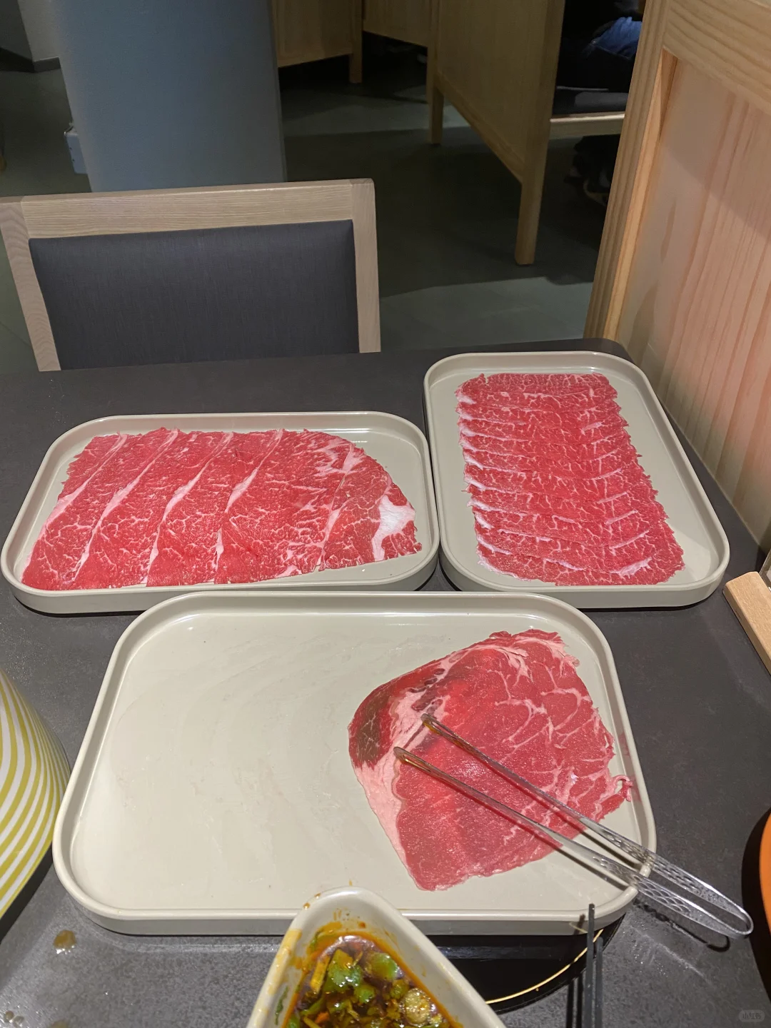 [种草R]牛肉一共有四款,我推荐大家吃小片的,肥瘦相间的比较嫩,自助餐的牛肉肯定没有那边豆捞40多一盘的雪花肥牛好吃