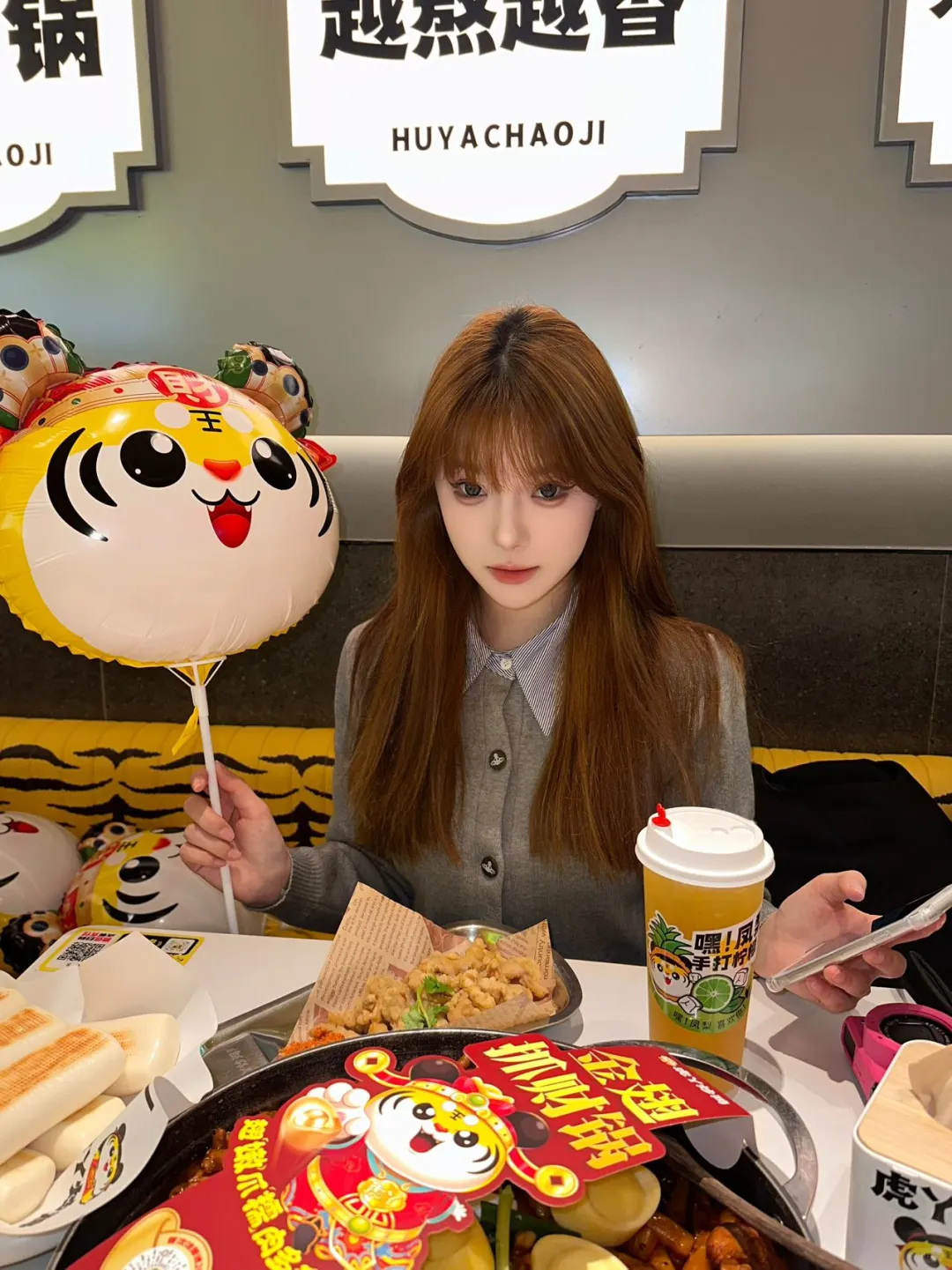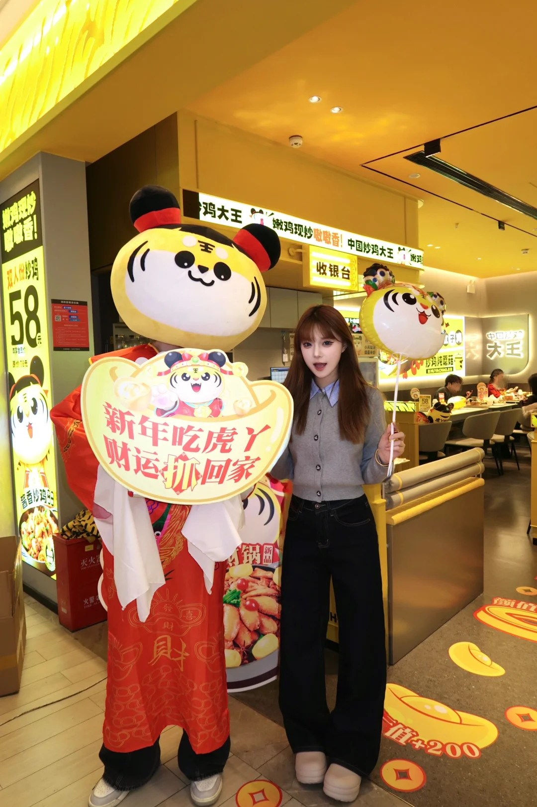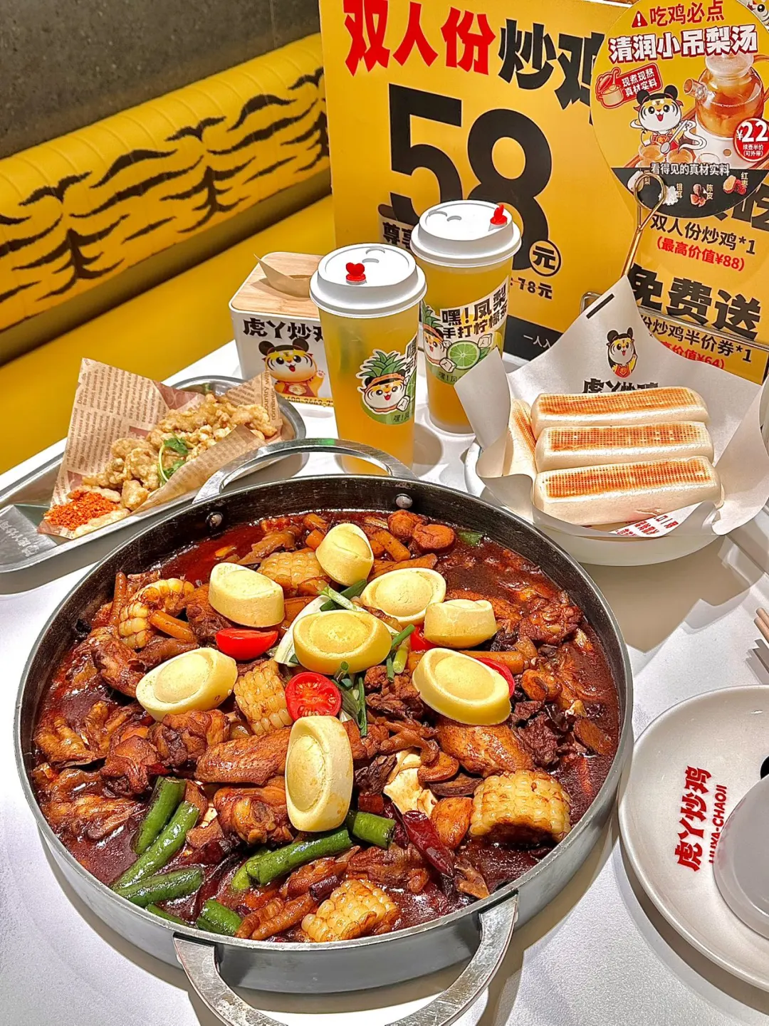 金翅抓财锅份量超足,鸡肉鲜嫩多汁,配菜有土豆、西兰花、豆角、圣女果、洋葱等,和鸡肉搭配吃超过瘾! 吃到最后记得点份皮带面,拌汤汁吃好吃绝了!隐藏吃法:把米饭团成饭团,泡在汤里也是一绝!还有超多小吃,锅巴土豆,茴香小油条,小酥肉等,味道都很不错。店内还有很多小活动 吃虎牙 送窗花(进店吃炒鸡就送一个窗花) 店内还有财神装扮可以合拍一小哦新年氛围拉满整个店内都喜气洋洋的