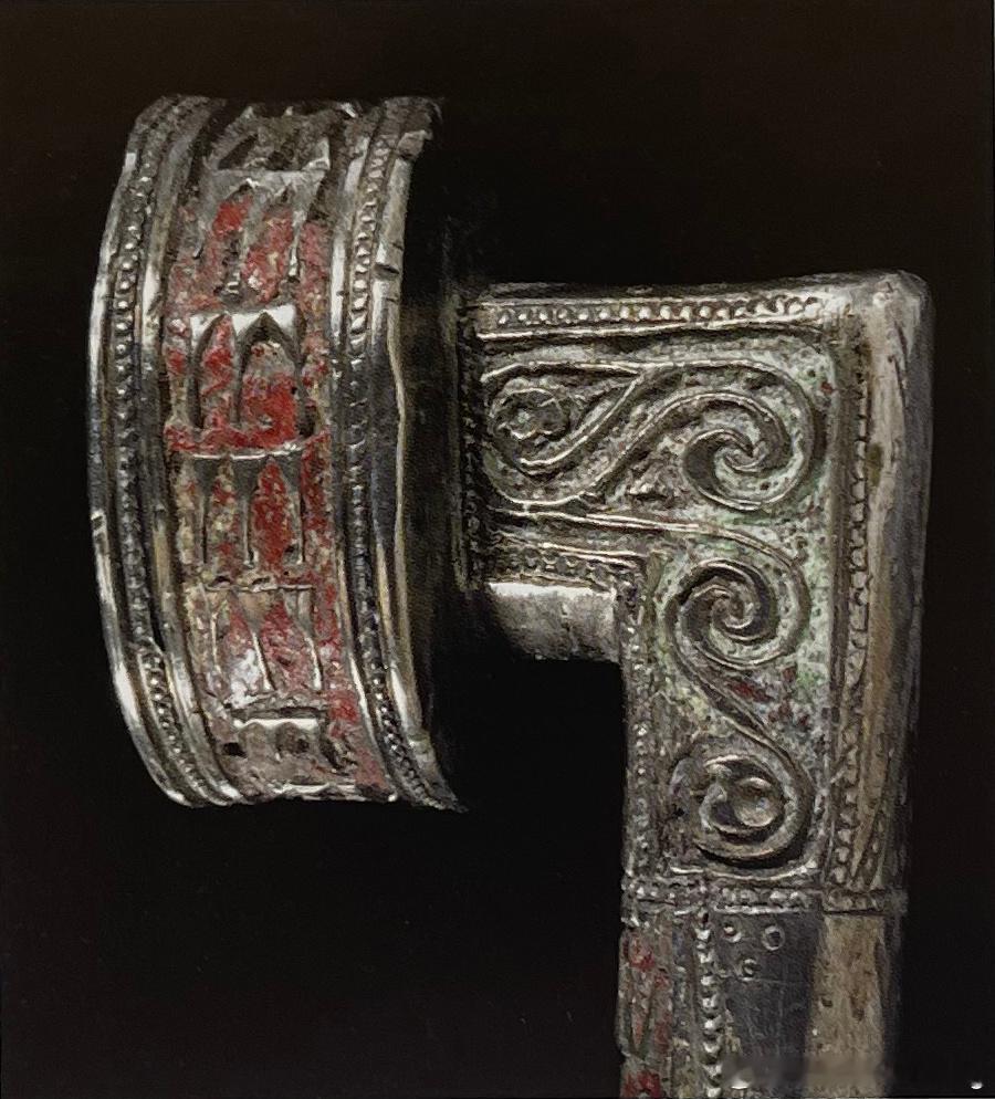 贵金属的使用、别针的尺寸和工艺都清楚地表明了其地位。作为珍贵的传家宝,这枚别针也经过了精心修复。虽然不知道这枚别针是在何处发现的,但银的使用以及与其他几枚圆盘头别针相同的细节表明,这枚别针是在爱尔兰(可能是在北部)制造的。这反过来又反映了当时人们可以获得银以及与英国西北部的皮克特人有联系。