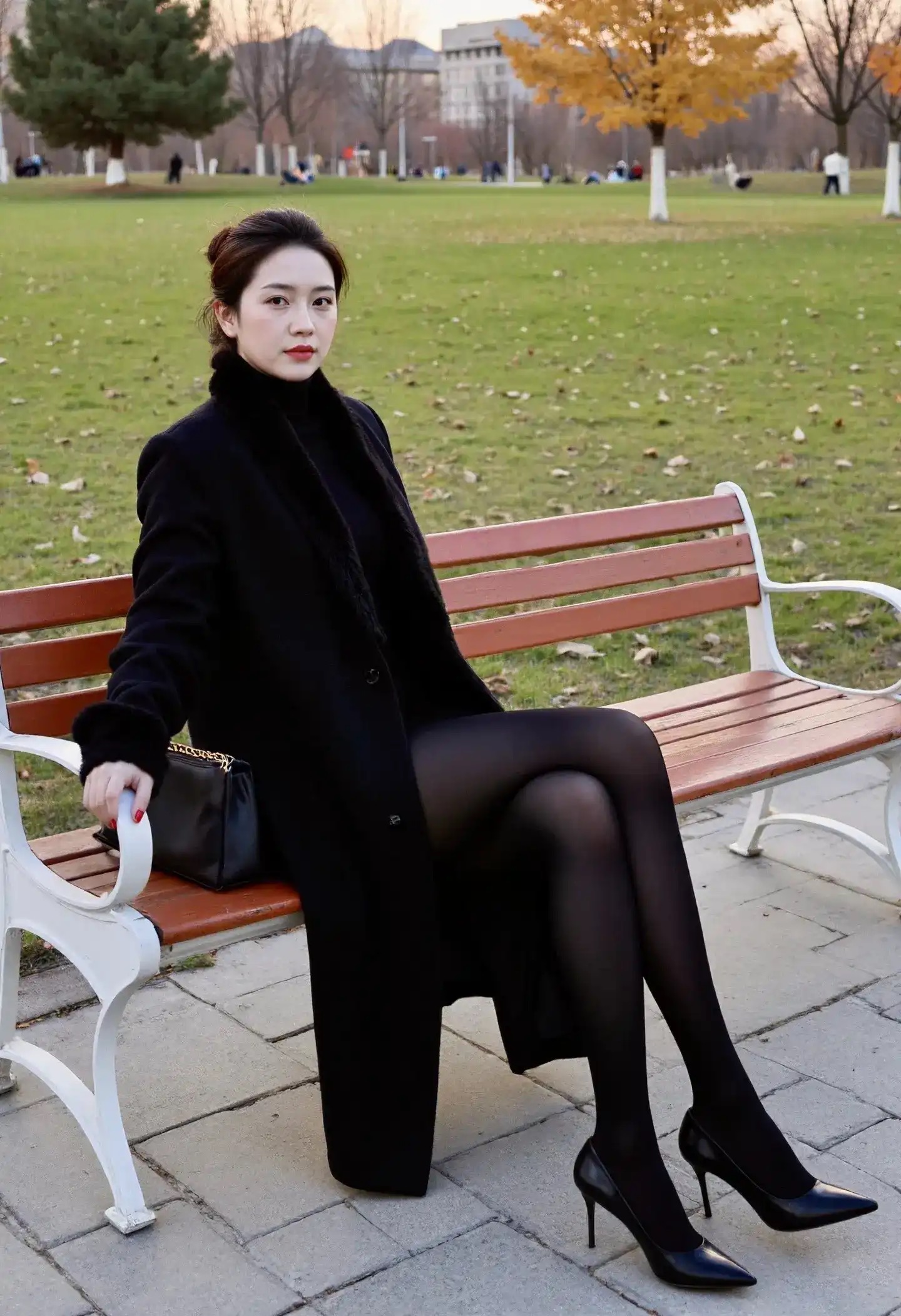 优雅气质风 身着黑色大衣,在公园长椅尽显优雅 黑丝高跟配大衣,我就是气质女王 坐