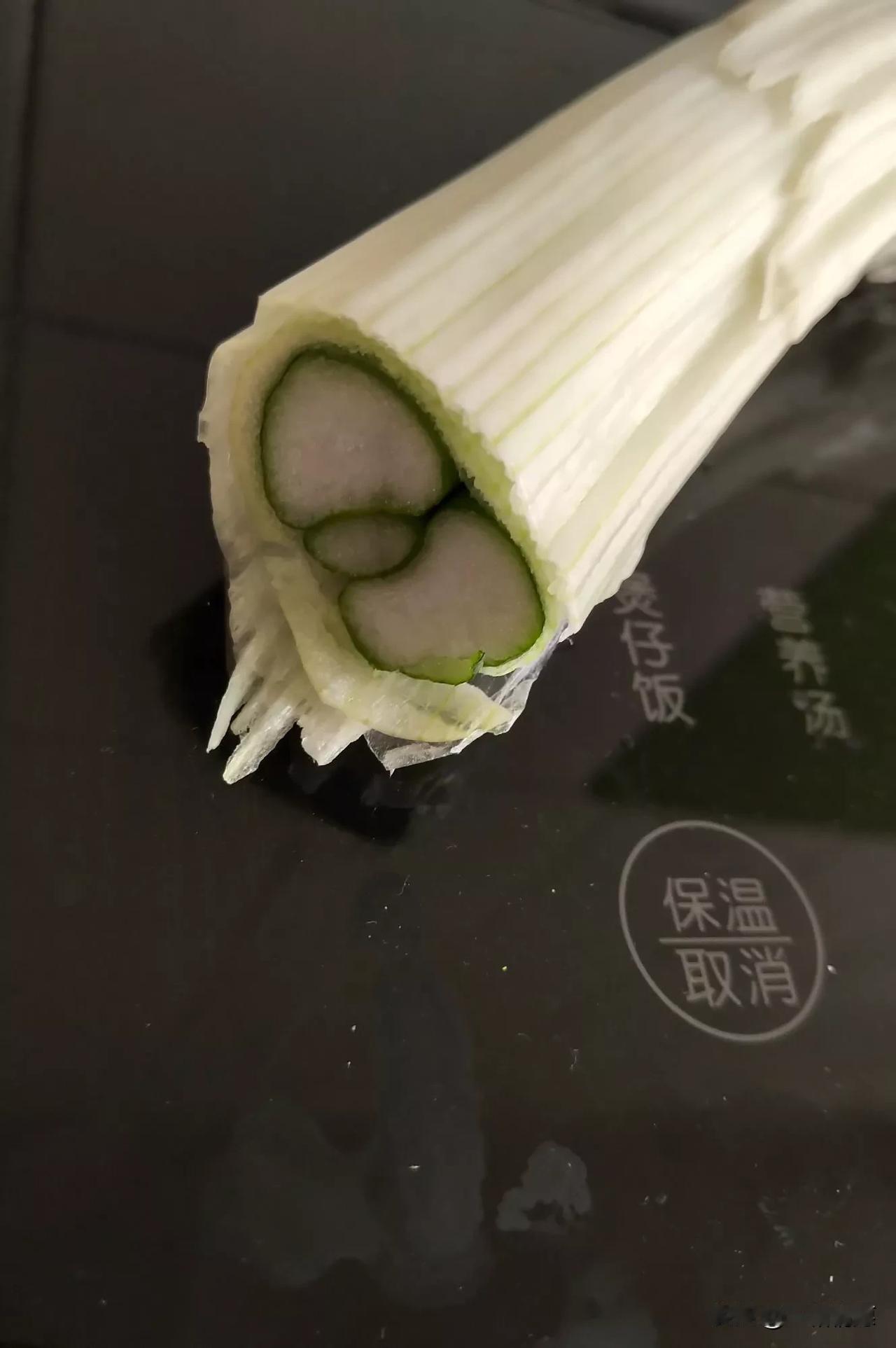 !微辛 ,无数山东人的最爱 ,今天切了棵大葱 ,请允许我不用根来形容 ,因为实在是太粗壮了 !生吃炒菜做汤烙饼做个花卷都用的上它 , 有的葱能长到一人多高 ,没有足够的支撑怎么能行 ,截面一看就明白了 ,多股并进 ,难怪山东人的标签里有 "大汉 "这个词 , 打两个蛋来个大葱 炒鸡蛋 !