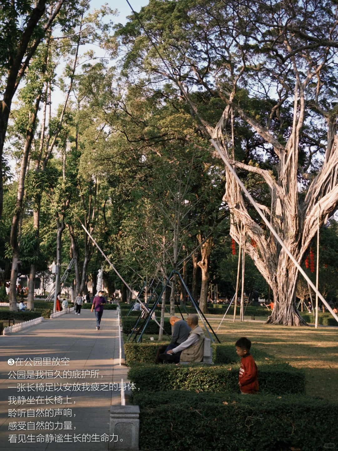 公园是我恒久的庇护所,一张长椅足以安放我疲乏的身体,我静坐在长椅上,聆听自然的声响,感受自然的力量,看见生命静谧生长的生命力。