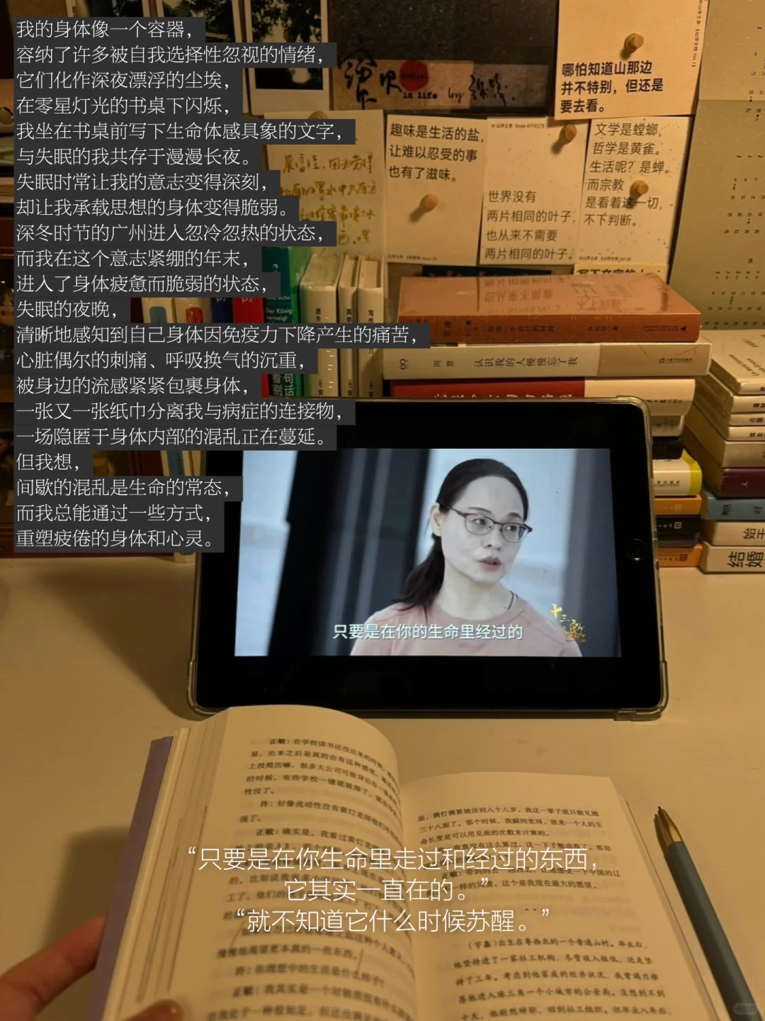 我的身体像一个容器,容纳了许多被自我选择性忽视的情绪,它们化作深夜漂浮的尘埃,在零星灯光的书桌下闪烁,我坐在书桌前写下生命体感具象的文字,与失眠的我共存于漫漫长夜。失眠时常让我的意志变得深刻,却让我承载思想的身体变得脆弱,一场隐匿于身体内部的混乱正在蔓延。我想,间歇的混乱是生命的常态,而我总能通过一些方式重塑疲倦的身体和心灵。
