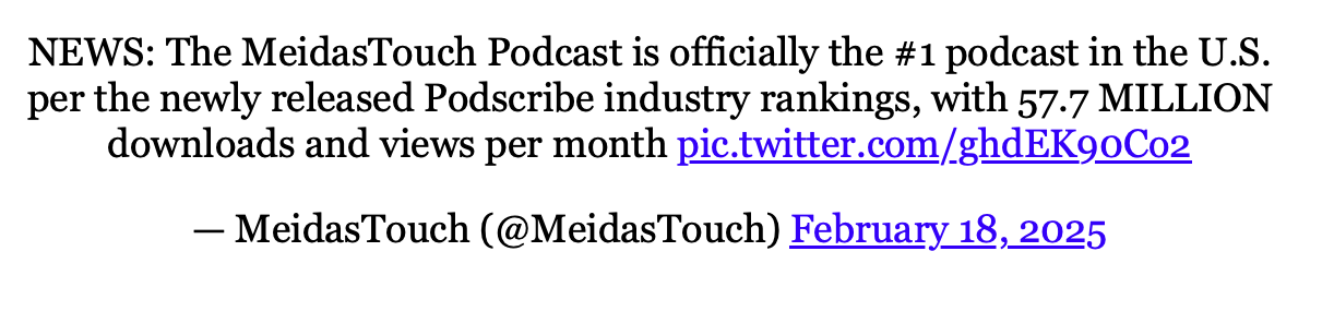 根据播客排名器 Podscribe 的数据,在过去一个月里,一个反特朗普的播客在大量下载量和浏览量上超过了 The Joe Rogan Experience。截至 2 月 18 日的数据显示,MeidasTouch 播客在过去一个月里的覆盖率增长了 101%,在音频平台和 YouTube 上获得了 5600 万次下载和观看。Joe Rogan 的节目以 4860 万次下载和观看量位居第二,比过去一个月下降了 32%。