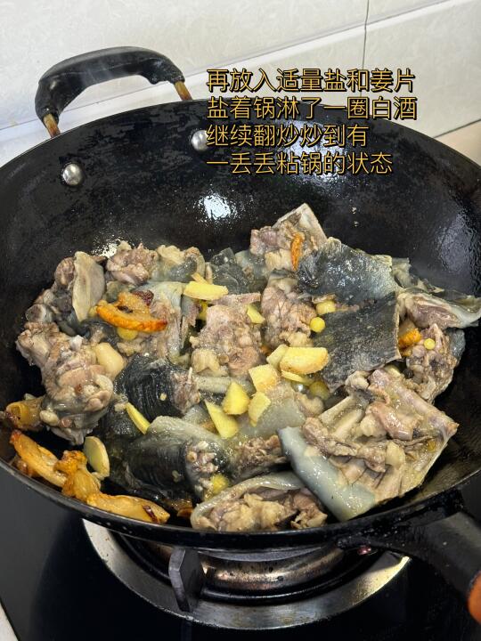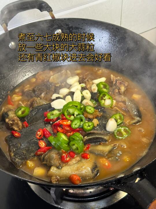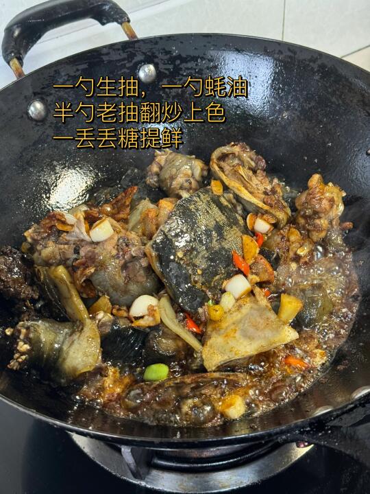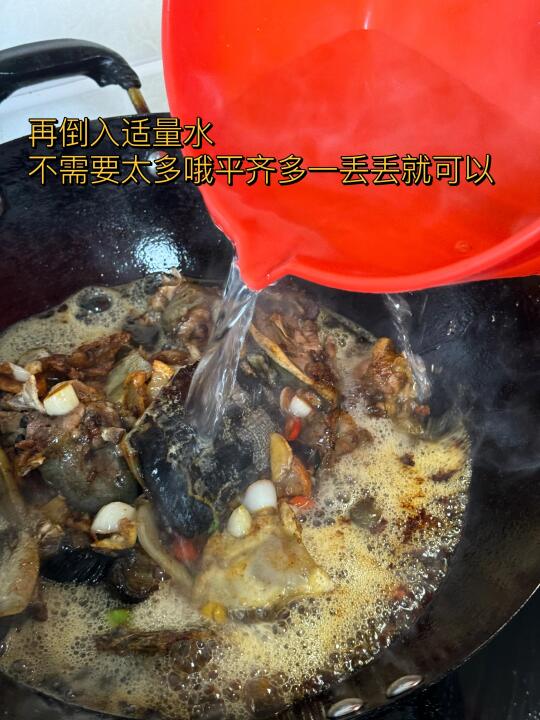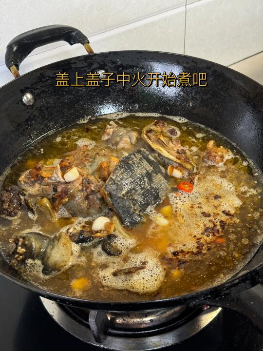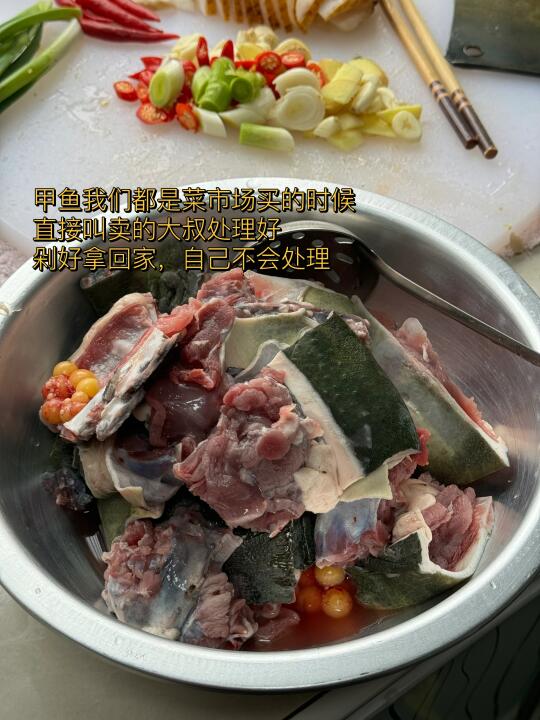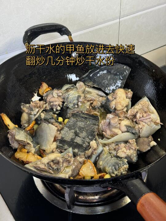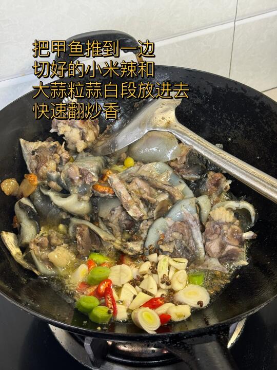 1: 甲鱼我们都是菜市场买的时候直接叫卖的大叔处理好剁好拿回家,自己不会处理 2: 冷水入锅,加入一勺料酒生姜片,葱结开火煮开 3: 煮开再煮两分钟左右就可以了 4: 用温水冲干净浮沫,一定要耐心一点 5: 锅里放一点腊肉或者五花肉煸炒出油,这样味道会更好哦 6: 沥干水的甲鱼放进去快速翻炒几分钟炒干水份 7: 再放入适量盐和姜片,盐着锅淋了一圈白酒,继续翻炒炒到有一丢丢粘锅的状态 8: 把甲鱼推到一边,切好的小米辣和大蒜粒蒜白段放进去快速翻炒香 9: 一勺生抽,一勺蚝油,半勺老抽翻炒上色,一丢丢糖提鲜 10: 建议你们家里有啤酒的放一瓶进去会更香 11: 再倒入适量水,不需要太多哦平齐多一丢丢就可以 12: 盖上盖子中火开始煮吧 13: 煮至六七成熟的时候放一些大块的大蒜粒,还有青红椒块进去会好看 14: 加入适量盐鸡粉调味即可,还可以放入多一点的蒜苗段 15: 喜欢汤少的可以水少放一点汤汁收的干一些,家里有砂锅的直接倒入电器砂锅,或者小锅里都可以哦