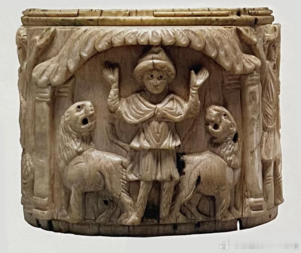 第二个场景在圣餐盘上,左侧的插图展示了但以理在狮子坑中,他被扔进狮子坑作为惩罚,因为他向上帝祈祷,违反了王室的法令,但狮子没有伤害但以理( 图2)。这发生在波斯帝国,因此但以理戴着弗里吉亚帽子和裤子。
