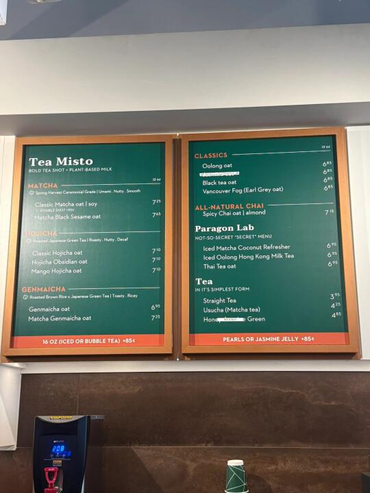 被其他小红薯宝宝种草的,最近我很上瘾和抹茶拿铁系列,星爸爸的抹茶拿铁就是最基本的口味,来了paragon完全是两种口感,按照Menu左边那一系列,除了芒果味的,其他我都喝过了,都好喝,不喜欢甜的朋友们可以告诉店员unsweet,图二三四,我把名字都标出来了,每一款都好喝,喝到嘴里有股回甘的香味,我带朋友来过,她也表示非常喜欢,每一杯都是店员用抹茶粉,玄米茶粉现做的,他们家的玄米茶拿铁也很好喝,推荐抹茶马芬也不错,也有卖抹茶鸡蛋仔的,但我还没试过,不过闻到香味应该不会错