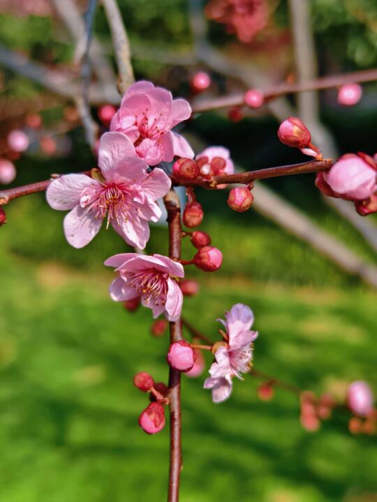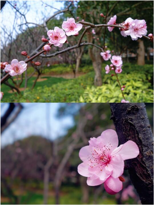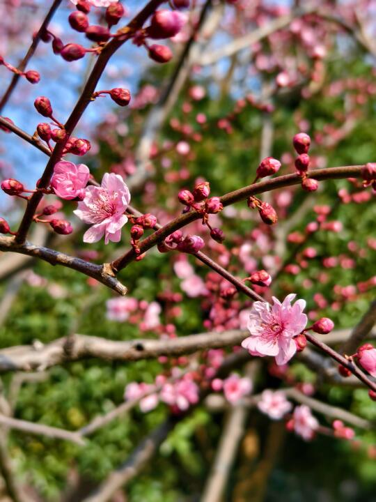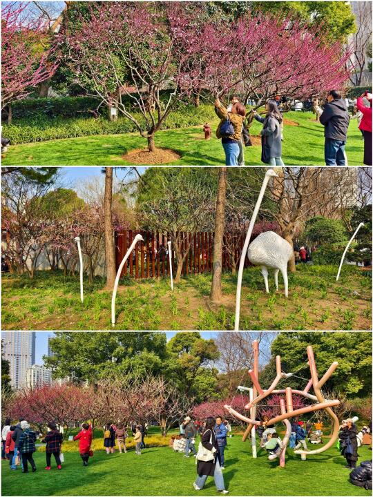 🔥静安雕塑公园的梅园中,有少量几棵美人梅。 🔥美人梅,由重瓣粉型梅花与红叶李杂交而成,是蔷薇科李属的落叶小乔木。尽管美人梅的名字中包含“梅”,但它与传统梅花在分类上有显著区别。
