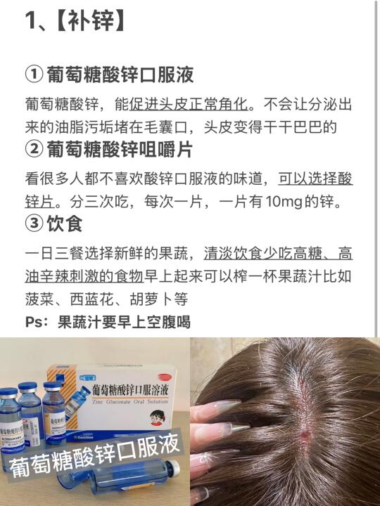 后来查了很多资料也问了皮肤科,说我这是脂溢性头皮炎,根据嘱咐的护理方法加上自己平时的参考找到了一套对应的方法:补锌——控油——抗炎修护✅
