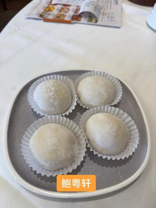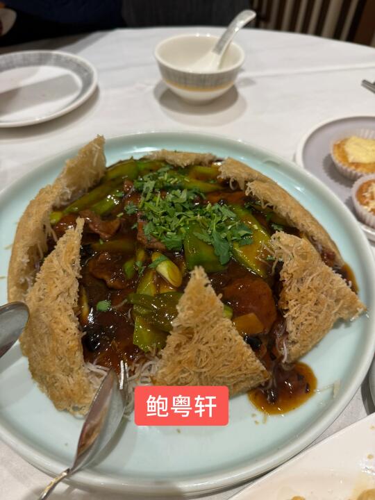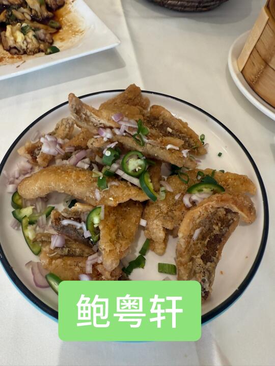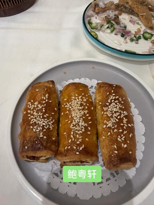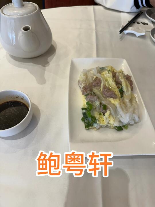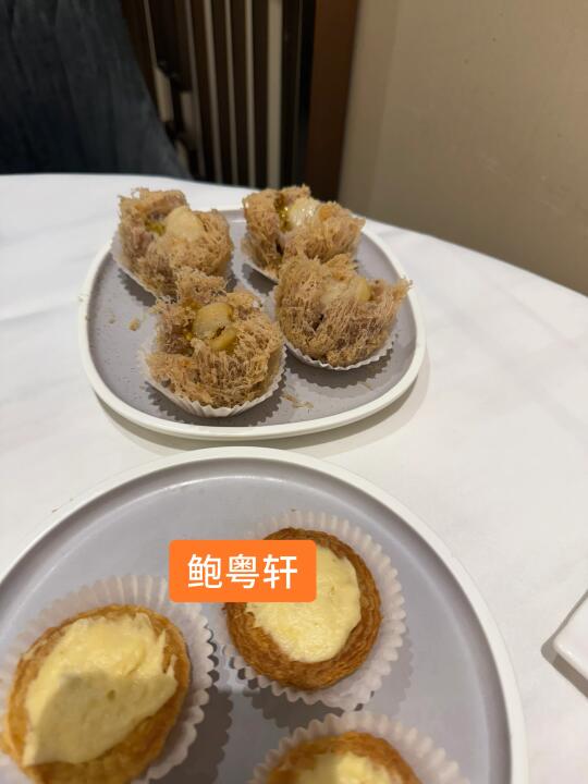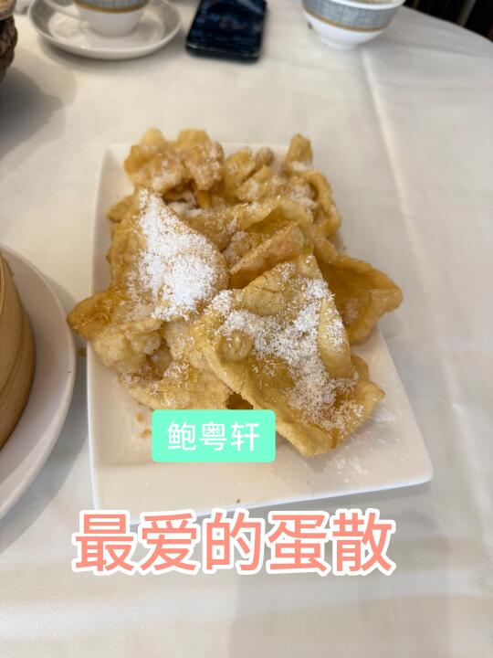[种草R]【鲍粤轩】的【蛋散】绝对是特色了,传统早茶餐厅一般也没有,蛋散也是早茶我最爱之一,他们家的炸鱼做的不错,人多的话可以点一份苦瓜牛肉炒粉,脆脆的,非常好吃,榴莲糯米糍和叉烧酥味道也很好,牛肉鸡蛋肠粉做的也好吃,丝滑的,没有怪味,最好的是他们家也有蜂巢糕
