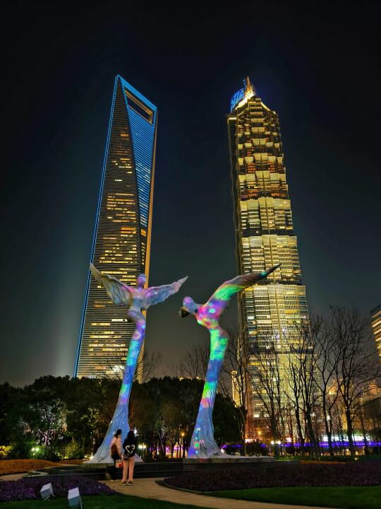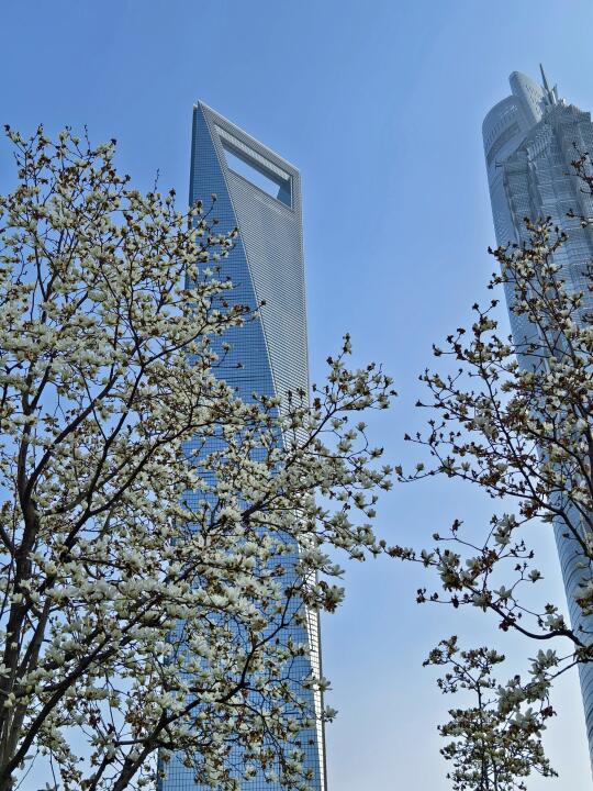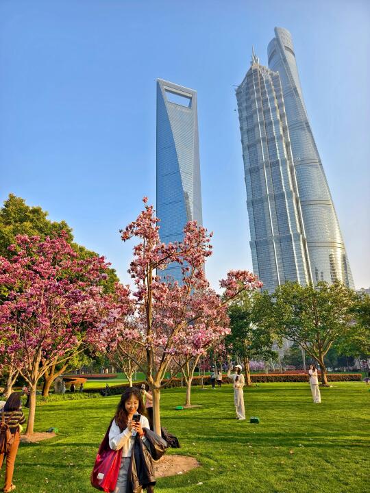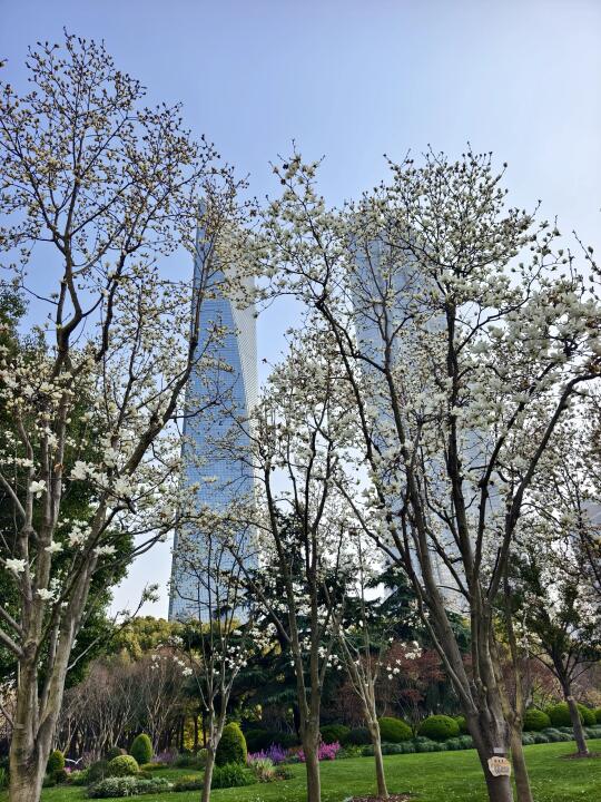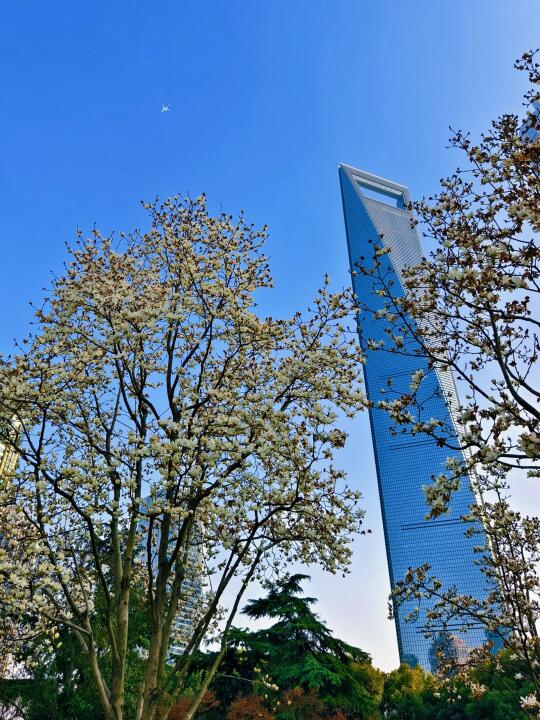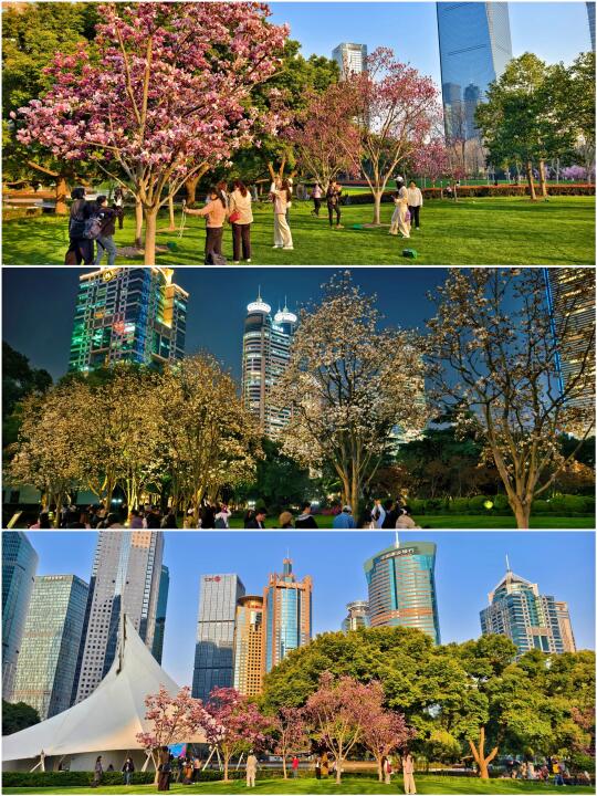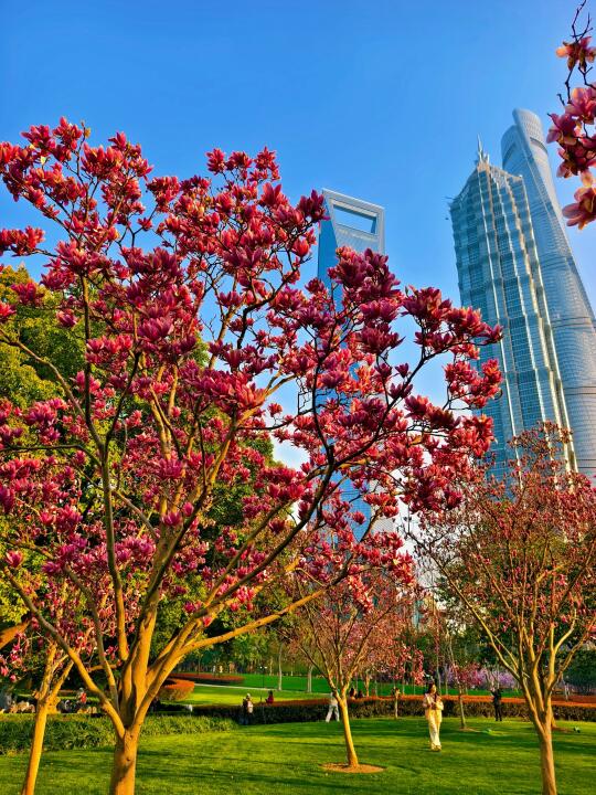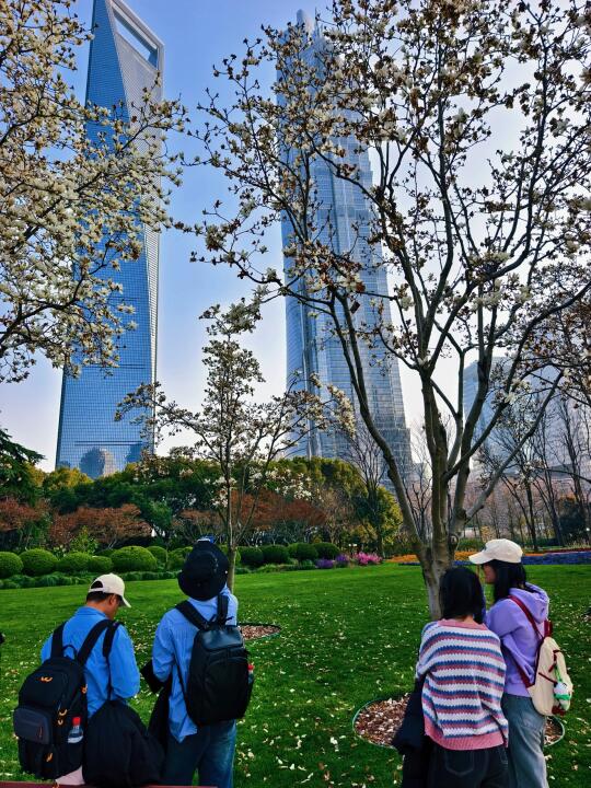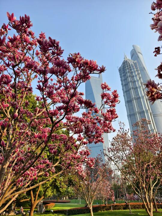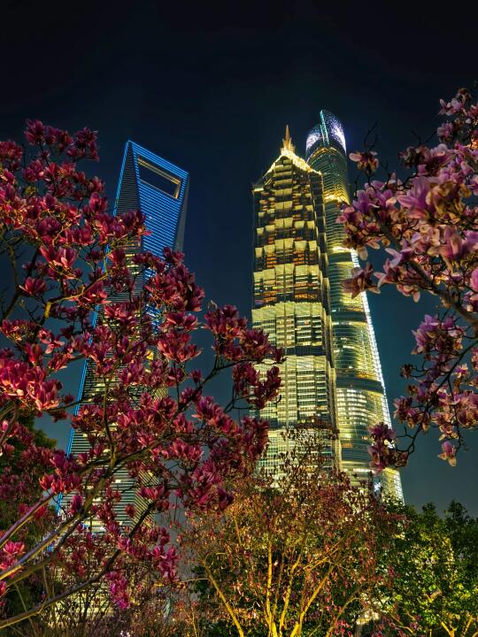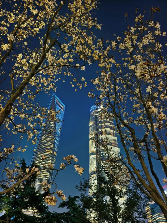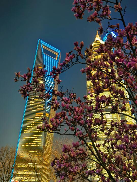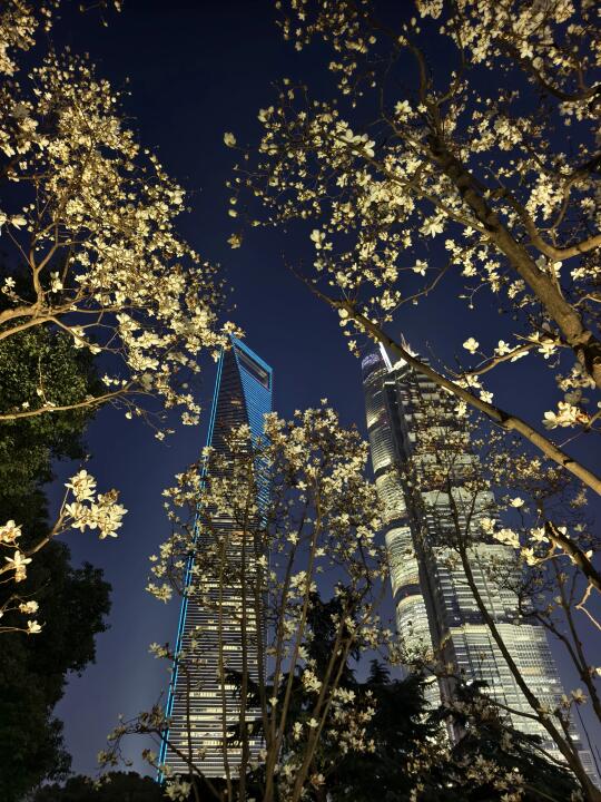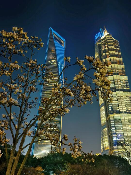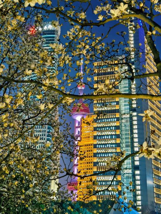 🔥陆家嘴中心绿地的白玉兰、紫玉兰开得正盛,魔都一年一度的市花~白玉兰同框陆家嘴四件套的时刻终于来了。 🔥感觉蓝调下的玉兰花比白天更漂亮,晚上也有很多人来拍照打卡。