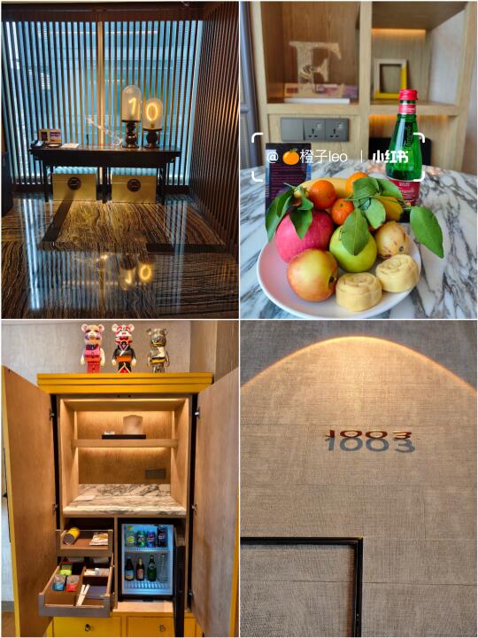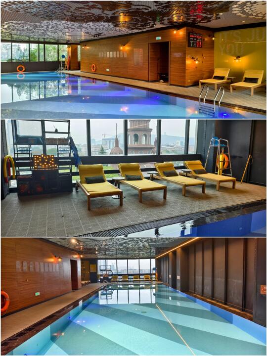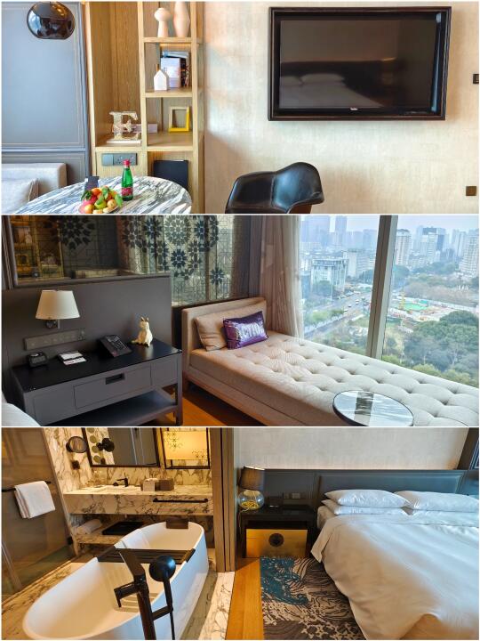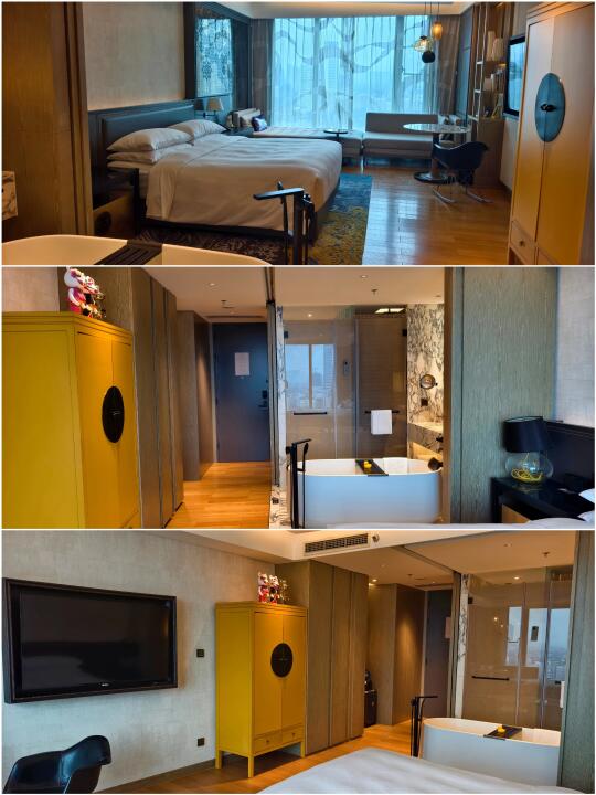 这家酒店套房特别少,订普通房,升级到了山景大床房。电梯厅有个玻璃灯显示楼层,用投影显示房间号,这些设计都挺有巧思的。房间视野不错,正对临平天主堂和人民广场,不过正好在修建地铁。(P7~P10)。