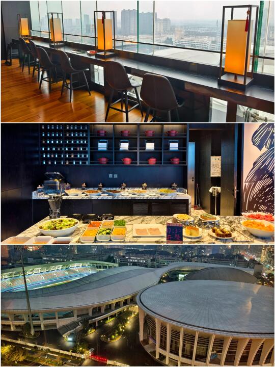 行政酒廊位于 16F,视野是挺不错的,外面能看到临平体育中心。欢乐时光中规中矩,不过人很多。(P11~P12)。