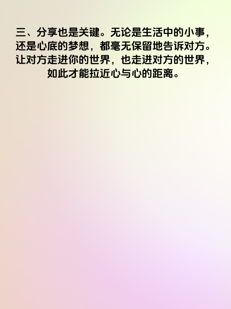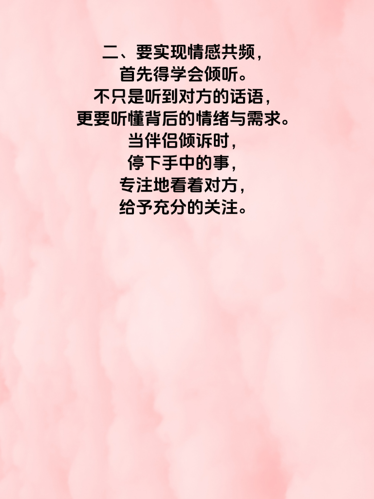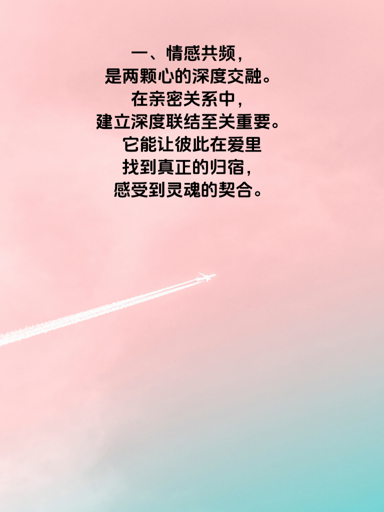 一、情感共频,是两颗心的深度交融。在亲密关系中,建立深度联结至关重要。它能让彼此在爱里找到真正的归宿,感受到灵魂的契合。 二、要实现情感共频,首先得学会倾听。不只是听到对方的话语,更要听懂背后的情绪与需求。当伴侣倾诉时,停下手中的事,专注地看着对方,给予充分的关注。 三、分享也是关键。无论是生活中的小事,还是心底的梦想,都毫无保留地告诉对方。让对方走进你的世界,也走进对方的世界,如此才能拉近心与心的距离。 四、再者,培养共同兴趣。一起做喜欢的事,在这个过程中,你们会有共同的话题,共同的体验,情感也会在互动中不断升温。 五、最后,保持同理心。站在对方角度看问题,理解对方的感受。当对方开心时,一同欢笑;当对方难过时,给予温暖的安慰。如此,情感共频就能让你们的爱愈发深厚,联结更加紧密。