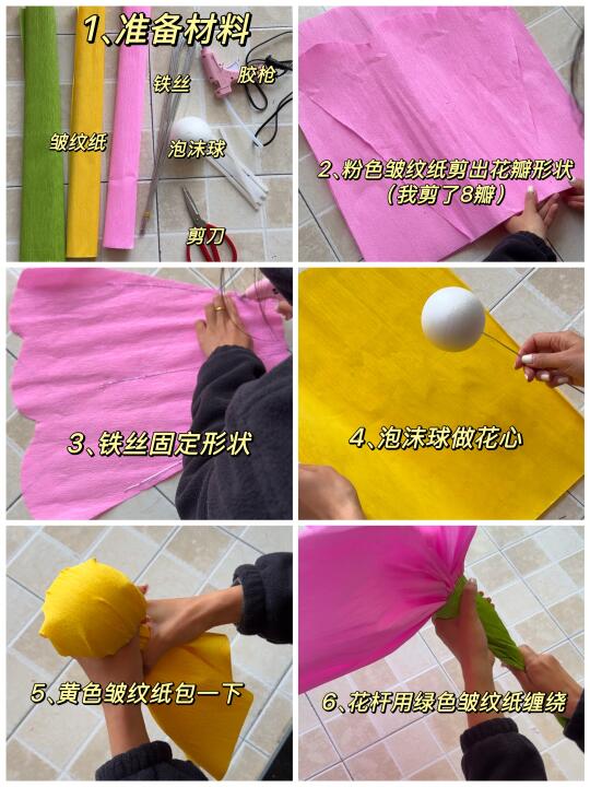 ✨用50*250cm的粉色皱纹纸剪8朵花瓣造型