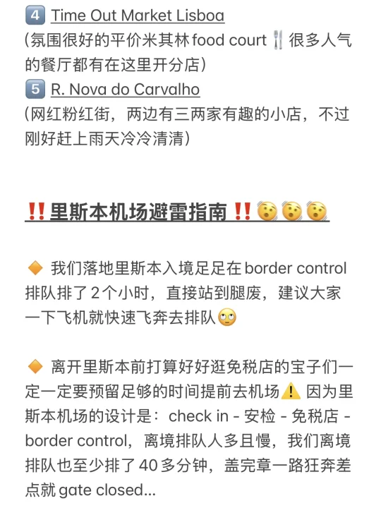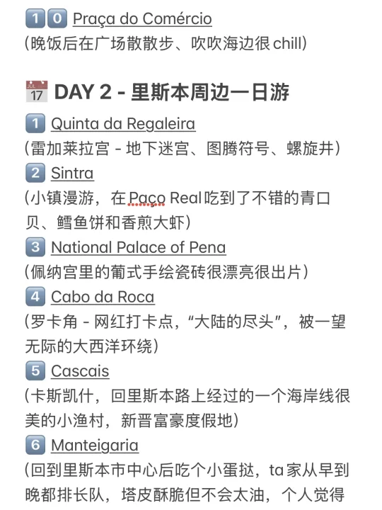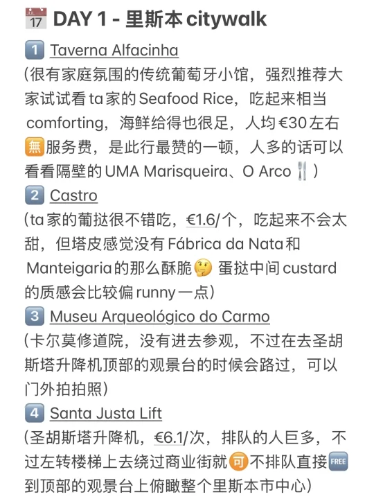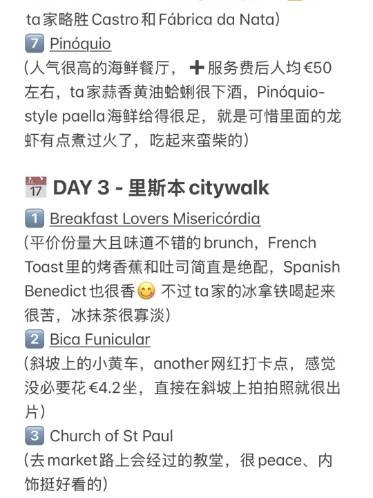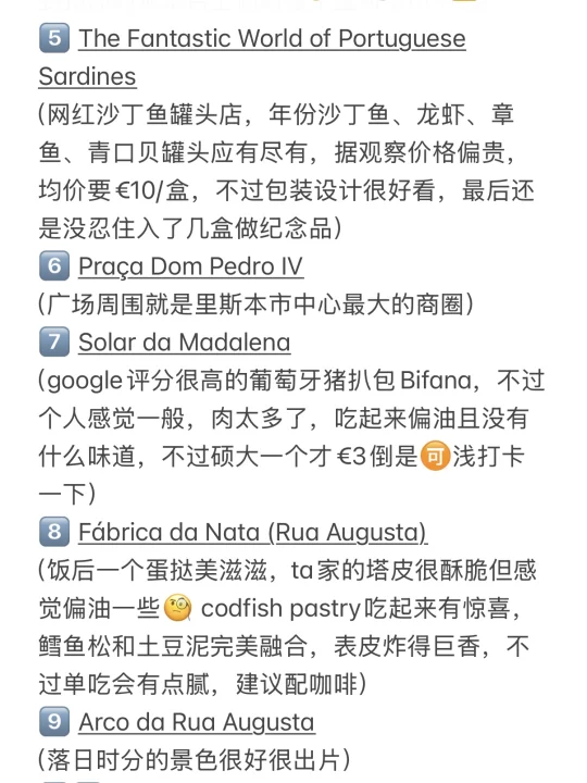 趁着复活节去Lisbon特种兵了三天,吃好喝好就是天气不大好[失望R] 海鲜饭、葡挞一次性吃个饱[派对R] 激情将这次的吃喝玩乐路线分享给大家~ . 【字数限制,完整路线&测评👉见图14-18】 📅 DAY 1 - 里斯本citywalk 1️⃣Taverna Alfacinha 传统葡萄牙海鲜饭 (人均€30🈚️服务费,海鲜饭此行最佳) 2️⃣Castro 吃葡挞 3️⃣Museu Arqueológico do Carmo 卡尔莫修道院 4️⃣Santa Justa Lift 圣胡斯塔升降机 5️⃣ The Fantastic World of Portuguese Sardines 网红沙丁鱼罐头店 6️⃣ Praça Dom Pedro IV 佩德罗四世⼴场 7️⃣ Solar da Madalena 吃猪扒包 8️⃣ Fábrica da Nata 吃葡挞 9️⃣ Arco da Rua Augusta & Praça do Comércio 饭后散步看落日 . 📅 DAY 2 - 里斯本周边一日游 1️⃣ Quinta da Regaleira 雷加莱拉宫 2️⃣ Sintra 小镇漫游 3️⃣ Paço Real 海鲜餐 4️⃣ National Palace of Pena 佩纳宫 5️⃣ Cabo da Roca 罗卡角 6️⃣ Cascais 小渔村 7️⃣ Manteigaria 吃蛋挞 8️⃣ Pinóquio 海鲜餐厅 . 📅 DAY 3 - 里斯本citywalk 1️⃣ Breakfast Lovers Misericórdia 吃brunch 2️⃣ Bica Funicular 斜坡小黄车 3️⃣ Time Out Market Lisboa 平价米其林聚集地 5️⃣ R. Nova do Carvalho 粉红街 . 👭: