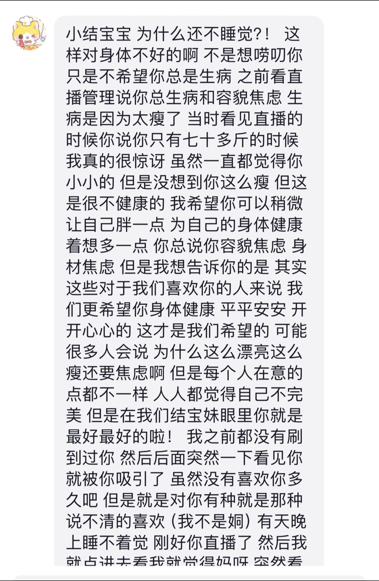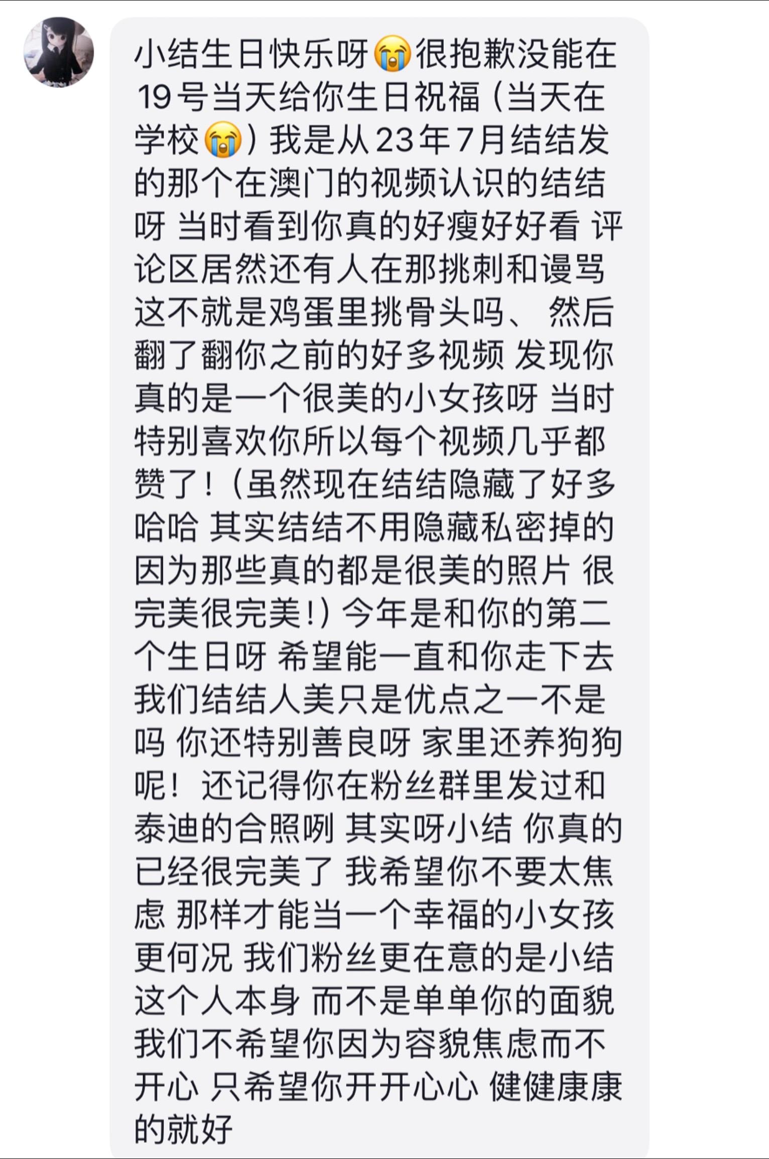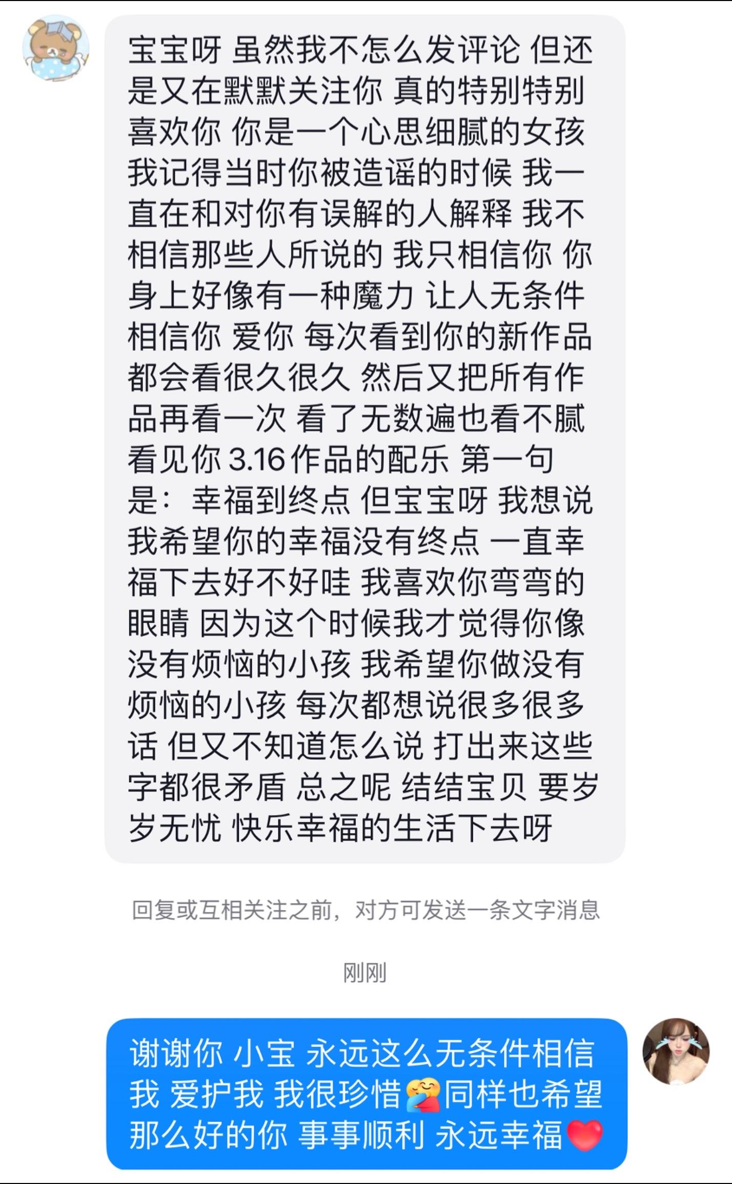 每当整理这些的时候 我都忍不住想哭......因为我觉得我才是那个应该把美好和幸福带给大家的人 但每次包容我缺点的是你们 一直夸奖鼓励我的是你们 当我被造谣 第一个站出来维护我的也是你们 永远无条件的支持我 大家关心着我的身体 在意我早不早睡 有没有好好吃饭 我那边天气好不好 为我用心做了很多会让我感到幸福的事 我面对一切困难都有独自解决的能力 但谢谢你们 没有让我一个人 我觉得我很幸运 能遇见这么多最好的女孩 陪我走了这么久 见证我的成长 我不是一颗遥不可及的星星 我也会义无反顾的保护你们 相信未来有一天