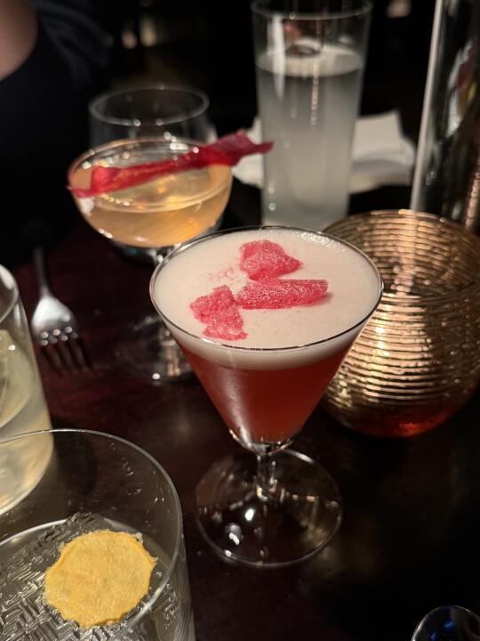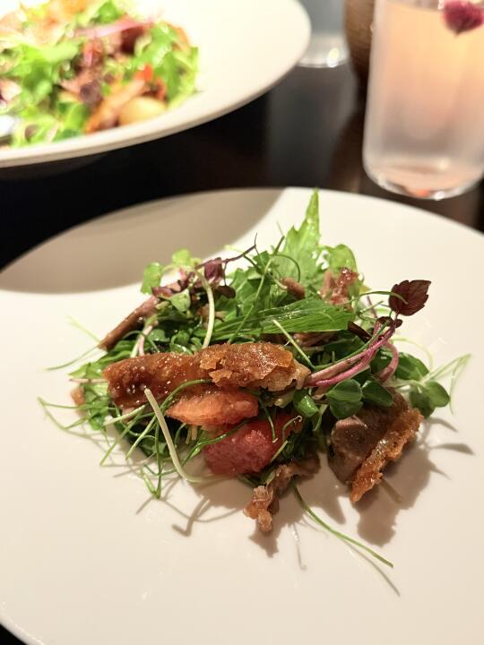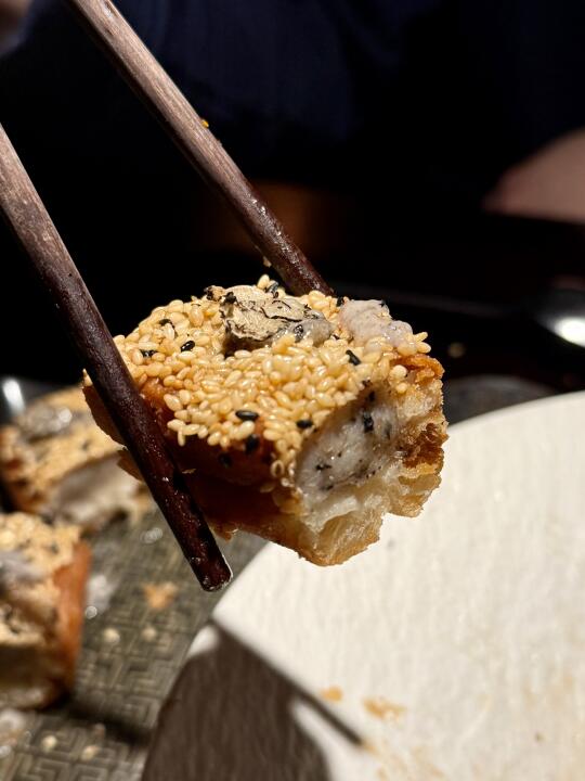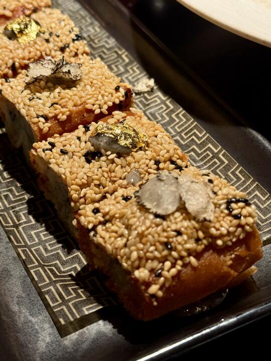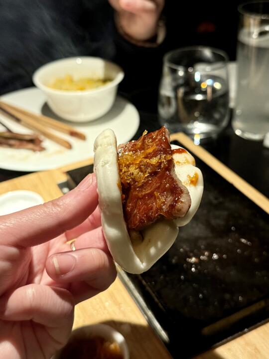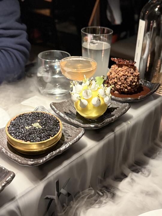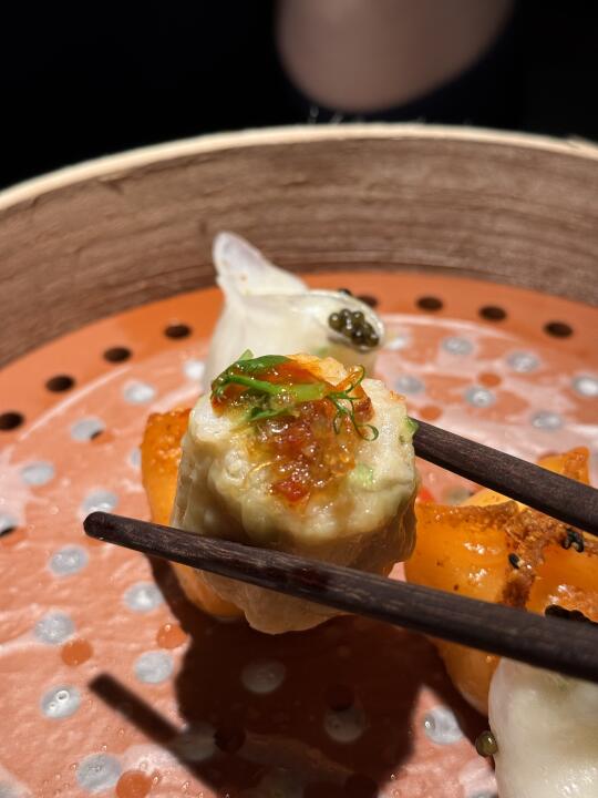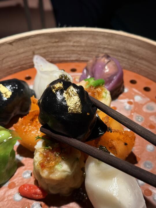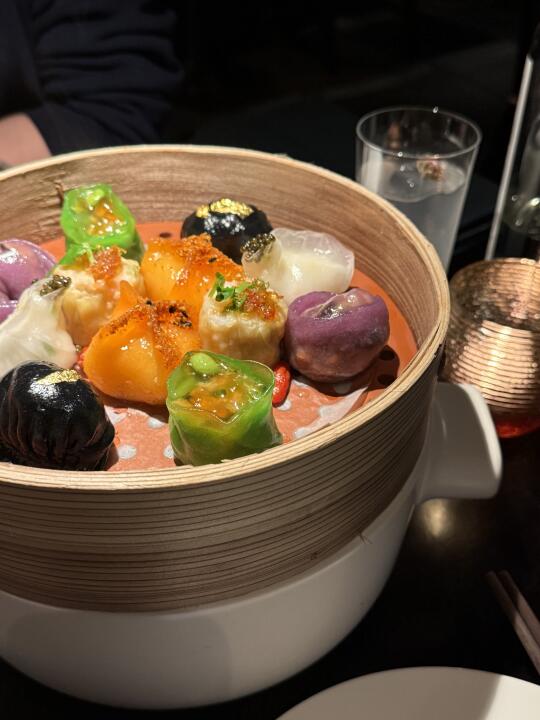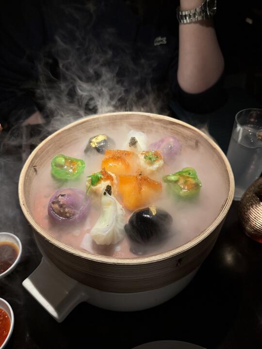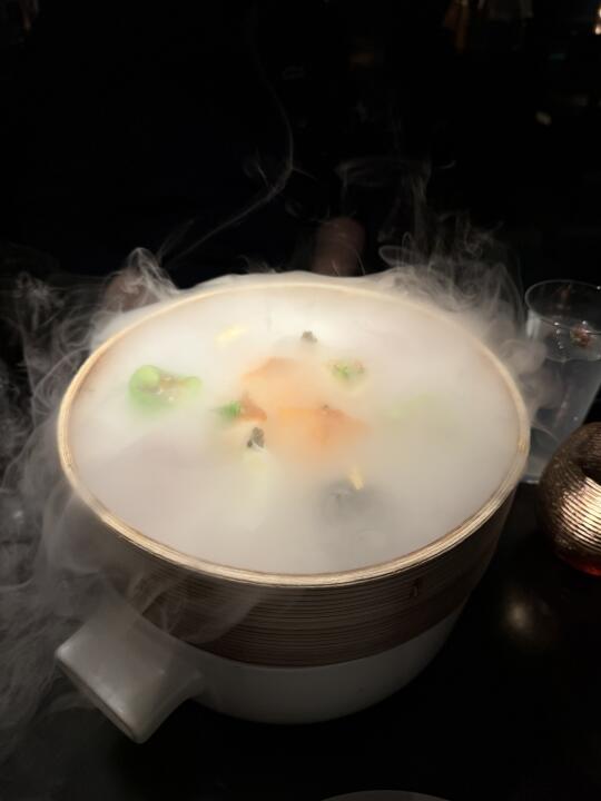 不得不感叹A5和牛的油脂分布也太丰富了,在烧红的石板上一面烤个30秒,再撒点粗盐,真的好香好香[色色R] 配的蘸料甜甜咸咸的,是类似于粤式海鲜酱的味道,热乎乎的刈包夹着油爆干贝丝,大葱and和牛,吃起来可太满足了🦐一份两个人share感觉都有点不够吃嘻嘻[哭惹R] . 黑松露虾多士很香脆,油条里虾滑塞得满满当当的,蛋黄酱的黑松露味道很浓郁但不腻歪,作为黑松露脑袋吃着可是太喜欢了💕 . 点心拼盘的上菜方式很霸气,干冰烟雾缭绕的,多宝鱼饺、虾饺、龙虾饺、蘑菇饺和脆笋素饺都很赞,配的蒜蓉辣椒酱相当够味🌶️ . 🍥 Hakkasan Mayfair 🍥 📍 17 Bruton St, London W1J 6QB 💰 £50-120【丰俭由人】 🥢 这次打卡的基本都是2025年春夏季新推出的创意菜,颜值和味道双在线嘻嘻[害羞R] 🍹 ta家的cocktail menu选择很多,我们吃完饭后在吧台坐了一会儿,打卡了ta家的几款慢酌鸡尾酒,就都挺不错喝的~[萌萌哒R] .