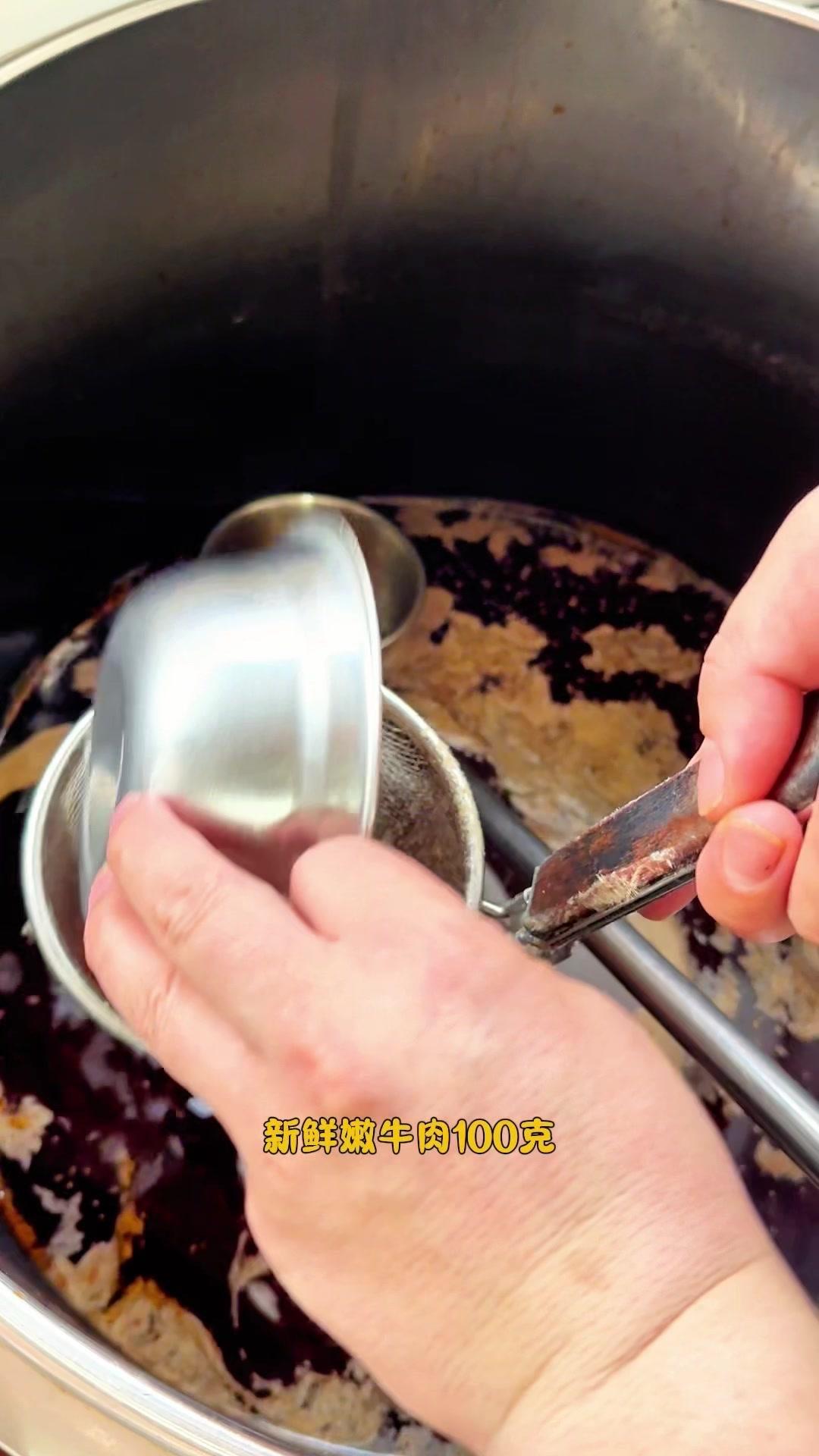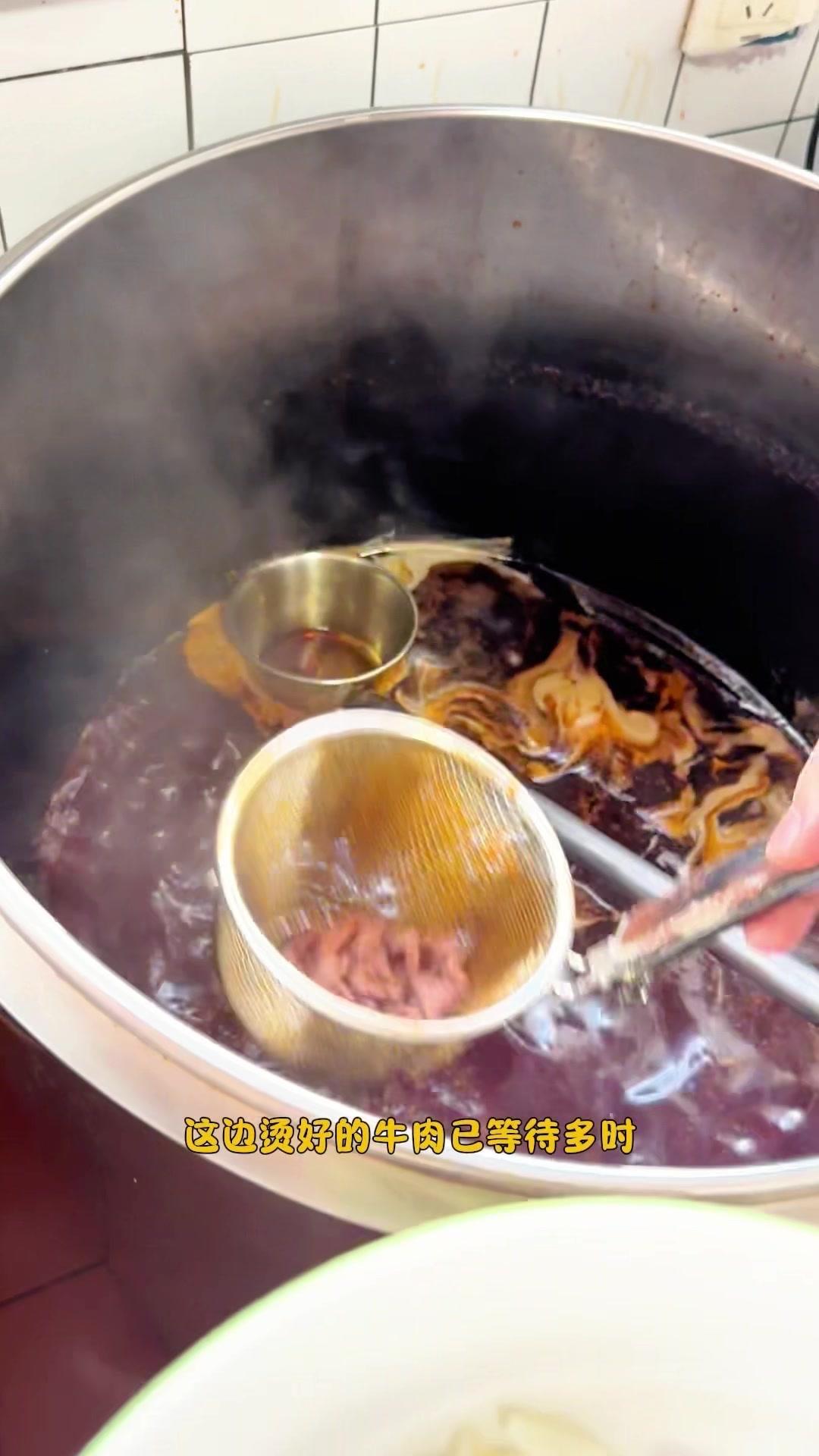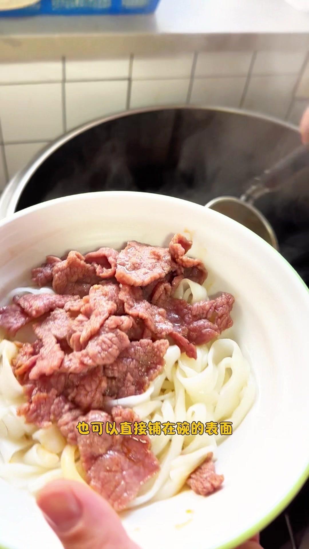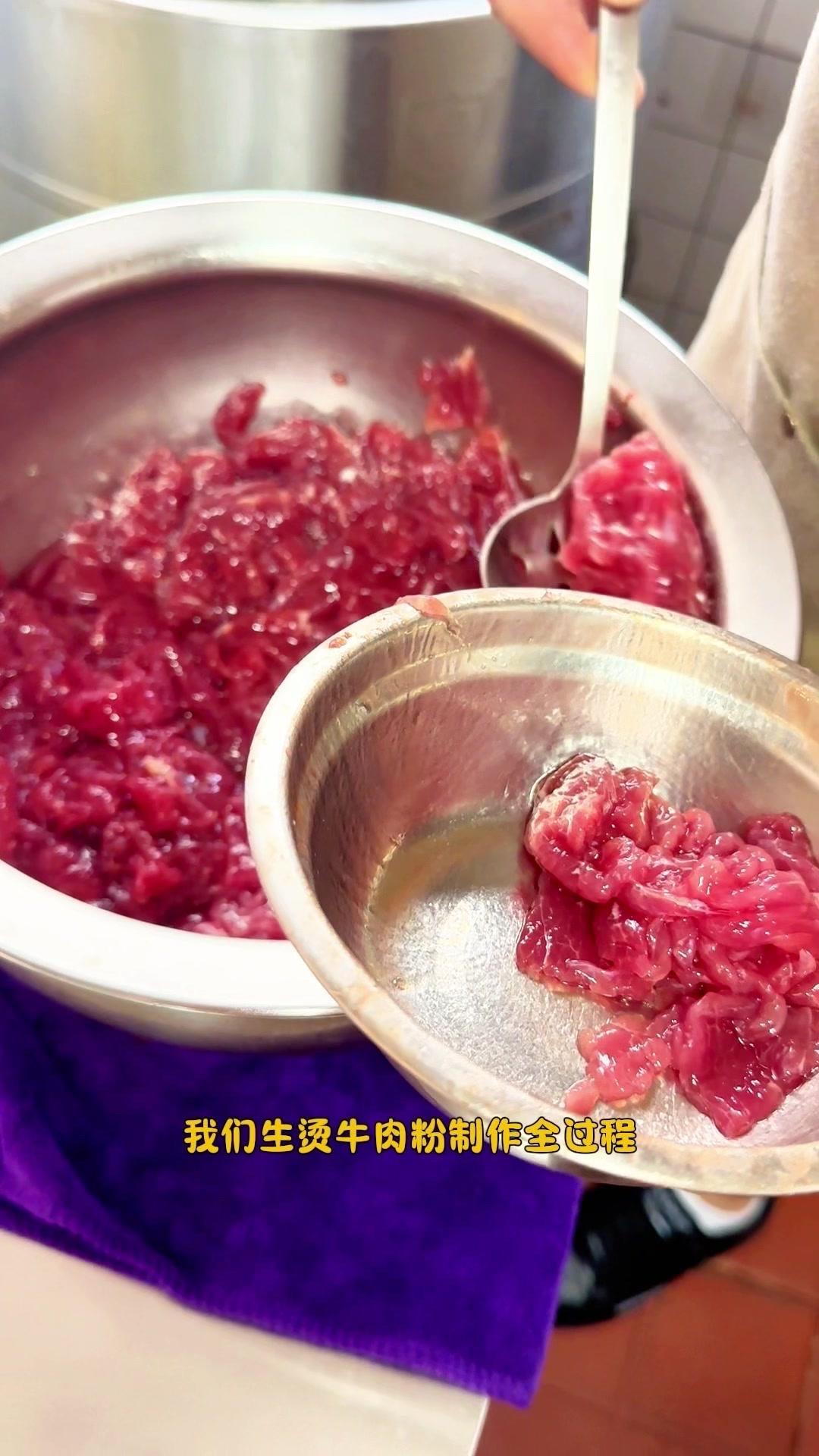 来武汉怎么少得了这样一碗生烫牛肉粉,今天来看一下我们生烫牛肉粉制作全过程。 1️⃣新鲜嫩牛肉100克,放入滚烫的高汤里面直接涮熟。牛肉的厚度只有均匀的2毫米,所以这烫的过程不允许它太持久,大概7-8秒或者10秒,牛肉已经由鲜红色变为粉嫩色。 2️⃣这边是准备好的宽粉,也是8成熟,只需要在锅里烫热烫软化就可以。3秒钟的功夫,宽粉由硬变软,就可以沥干水分倒入碗中。 3️⃣河边烫好的牛肉已等待多时,可以直接铺在碗的表面。这粉嫩的颜色应该是刚满18岁的样子,浓郁的高汤让这碗粉瞬间有了迷人的魅力,白里透着红,让人忍不住都要多看两眼。 4️⃣下面进入调味环节,榨菜、酱油、辣椒油,再给半勺浓郁的牛肉卤汤,加点海带去油腻,入味的小吃也是非常不错。来一个卤蛋,给生活加加油,这么一碗生烫牛肉粉就做好了。 如果这碗粉让你垂涎欲滴,那小菜的加入会让你流连忘返。要想生活过得去,必须带点绿,这迷人的小葱花肯定是少不了。要想味道好,调料少不了,桌子上这些小料一样加一点,吃不了亏上不了当,小料的加入让这碗粉看起来瞬间食欲大增。 用餐需注意,一定记得用嘴吃。
