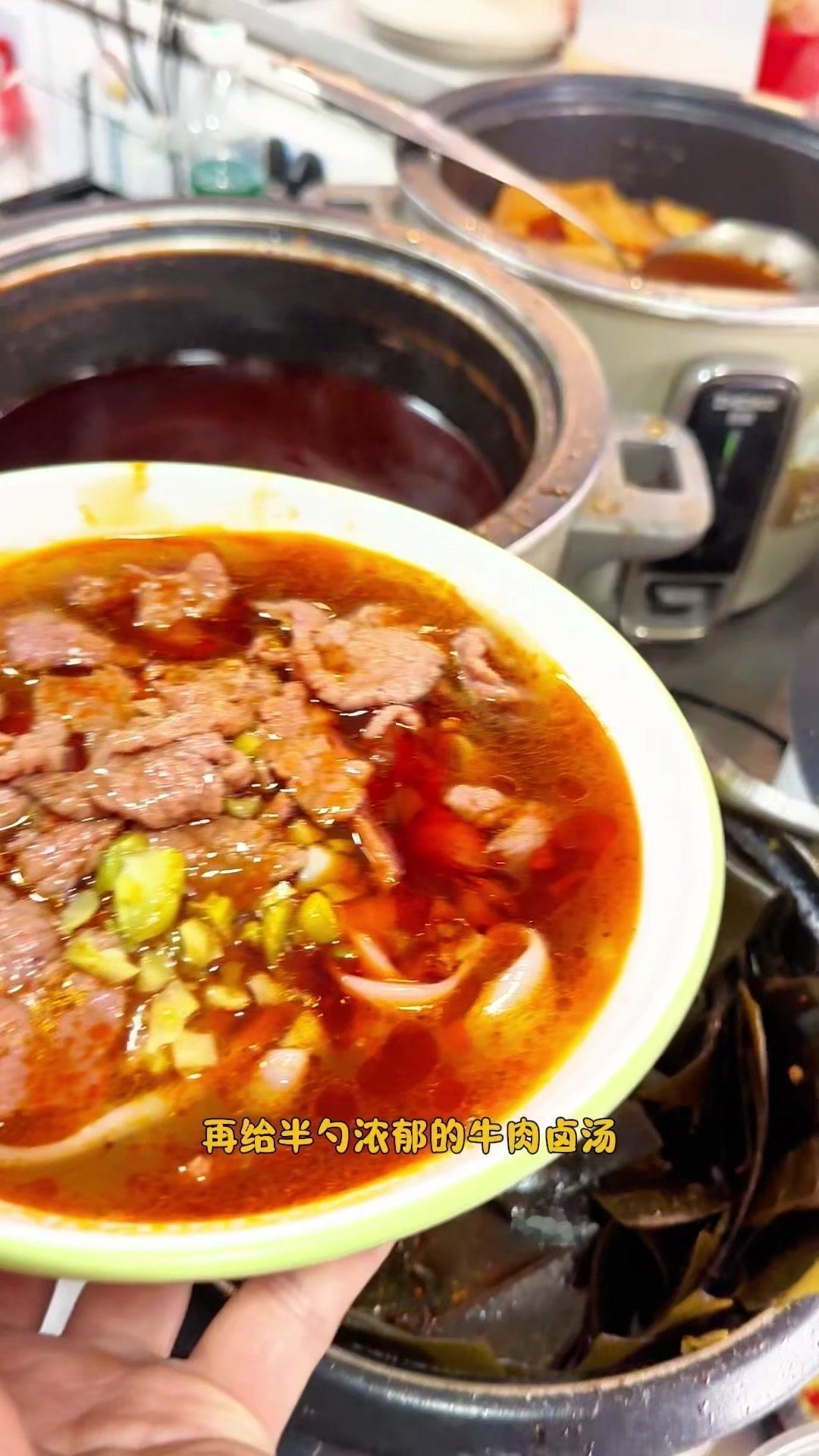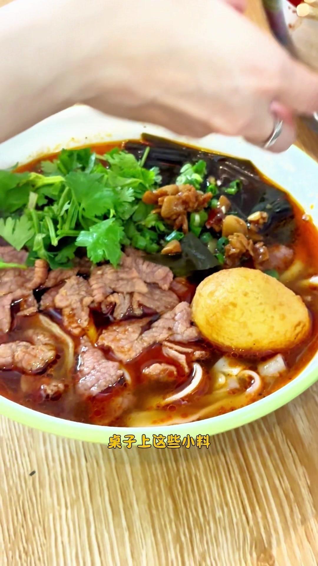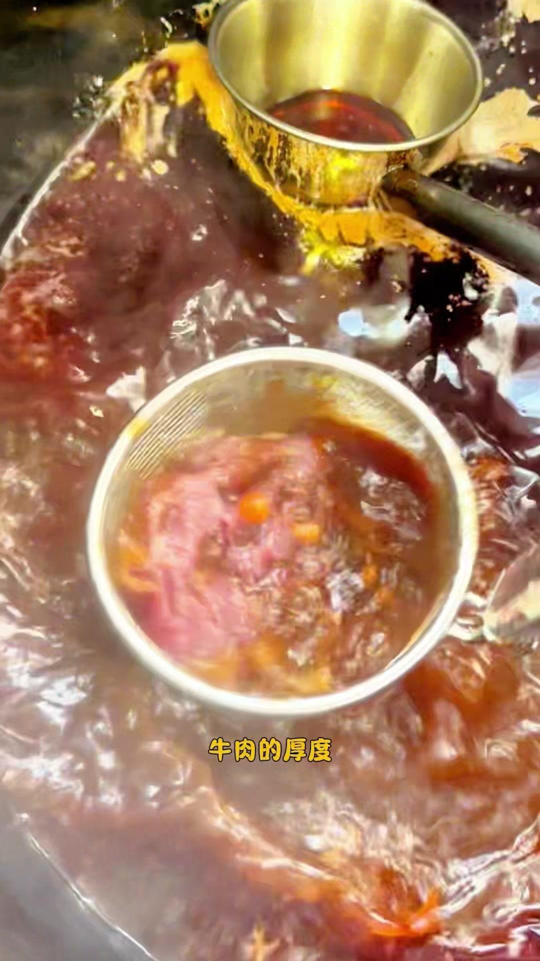 来武汉怎么少得了这样一碗生烫牛肉粉,今天来看一下我们生烫牛肉粉制作全过程。 1️⃣新鲜嫩牛肉100克,放入滚烫的高汤里面直接涮熟。牛肉的厚度只有均匀的2毫米,所以这烫的过程不允许它太持久,大概7-8秒或者10秒,牛肉已经由鲜红色变为粉嫩色。 2️⃣这边是准备好的宽粉,也是8成熟,只需要在锅里烫热烫软化就可以。3秒钟的功夫,宽粉由硬变软,就可以沥干水分倒入碗中。 3️⃣河边烫好的牛肉已等待多时,可以直接铺在碗的表面。这粉嫩的颜色应该是刚满18岁的样子,浓郁的高汤让这碗粉瞬间有了迷人的魅力,白里透着红,让人忍不住都要多看两眼。 4️⃣下面进入调味环节,榨菜、酱油、辣椒油,再给半勺浓郁的牛肉卤汤,加点海带去油腻,入味的小吃也是非常不错。来一个卤蛋,给生活加加油,这么一碗生烫牛肉粉就做好了。 如果这碗粉让你垂涎欲滴,那小菜的加入会让你流连忘返。要想生活过得去,必须带点绿,这迷人的小葱花肯定是少不了。要想味道好,调料少不了,桌子上这些小料一样加一点,吃不了亏上不了当,小料的加入让这碗粉看起来瞬间食欲大增。 用餐需注意,一定记得用嘴吃。