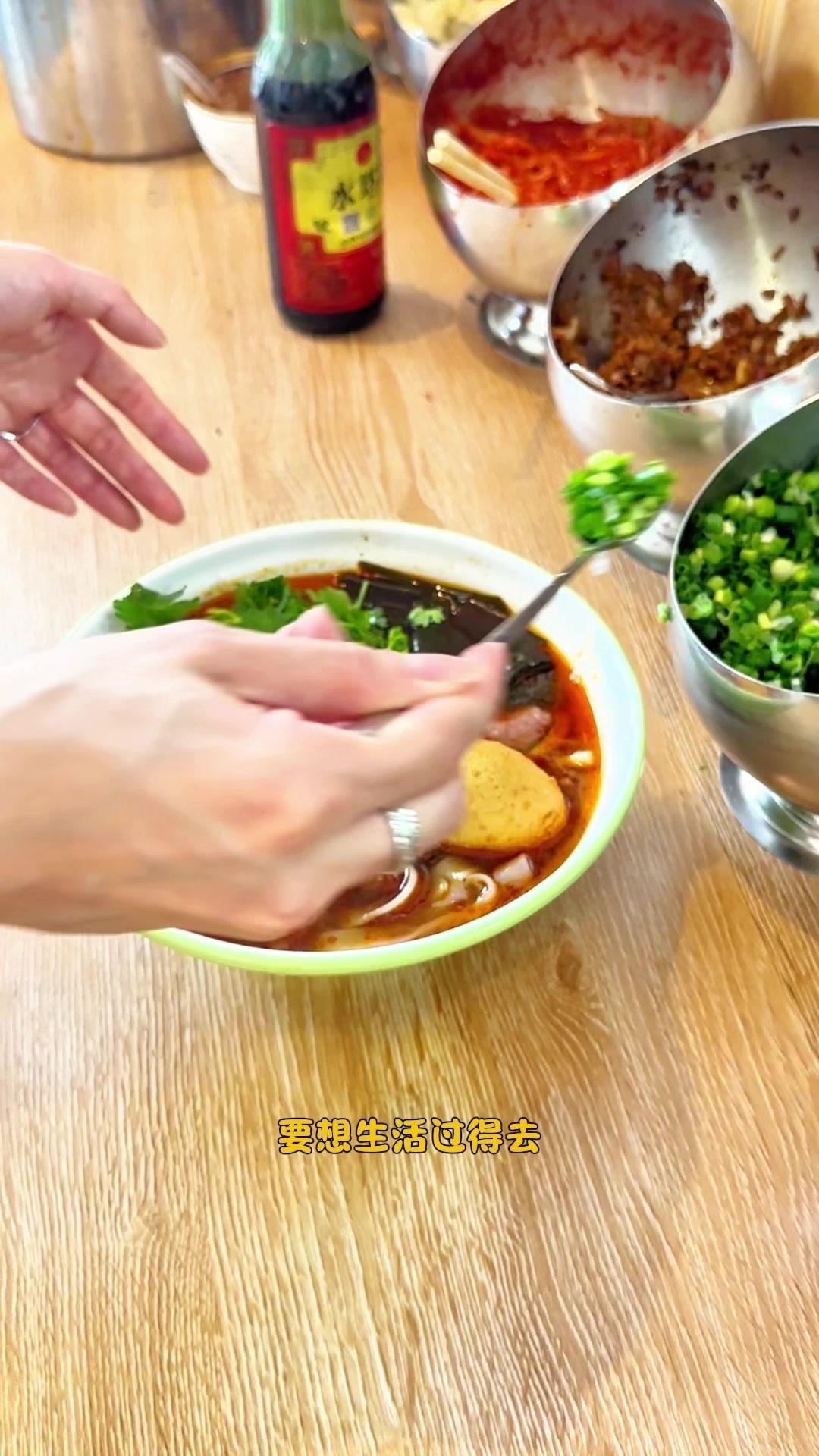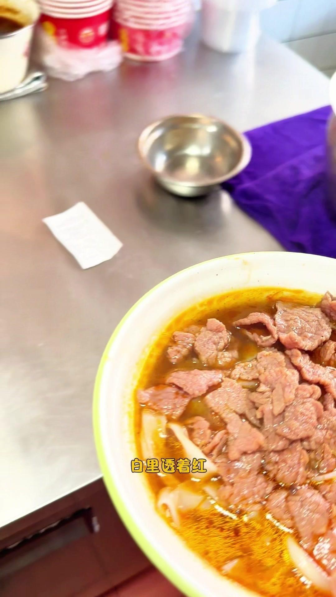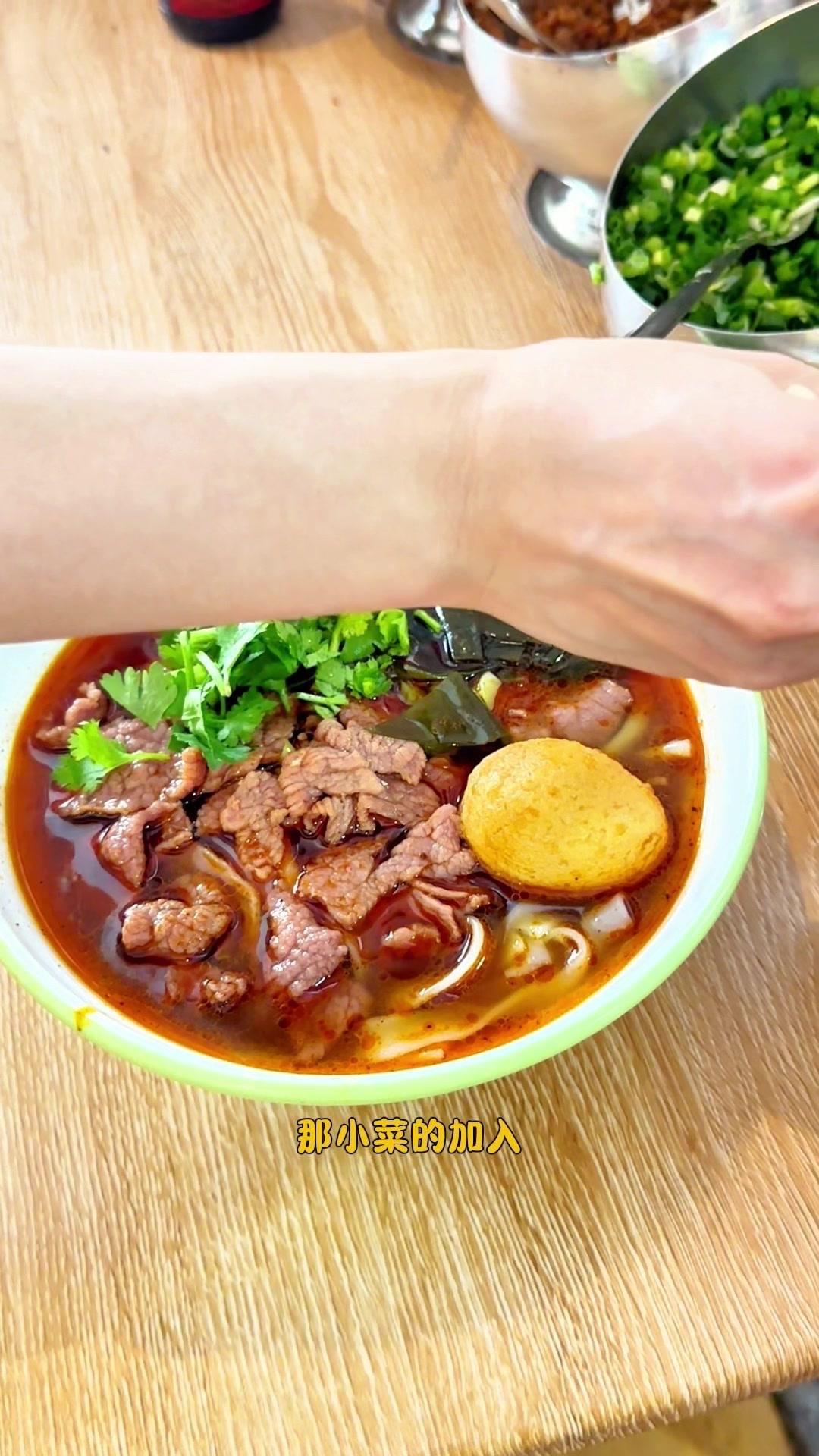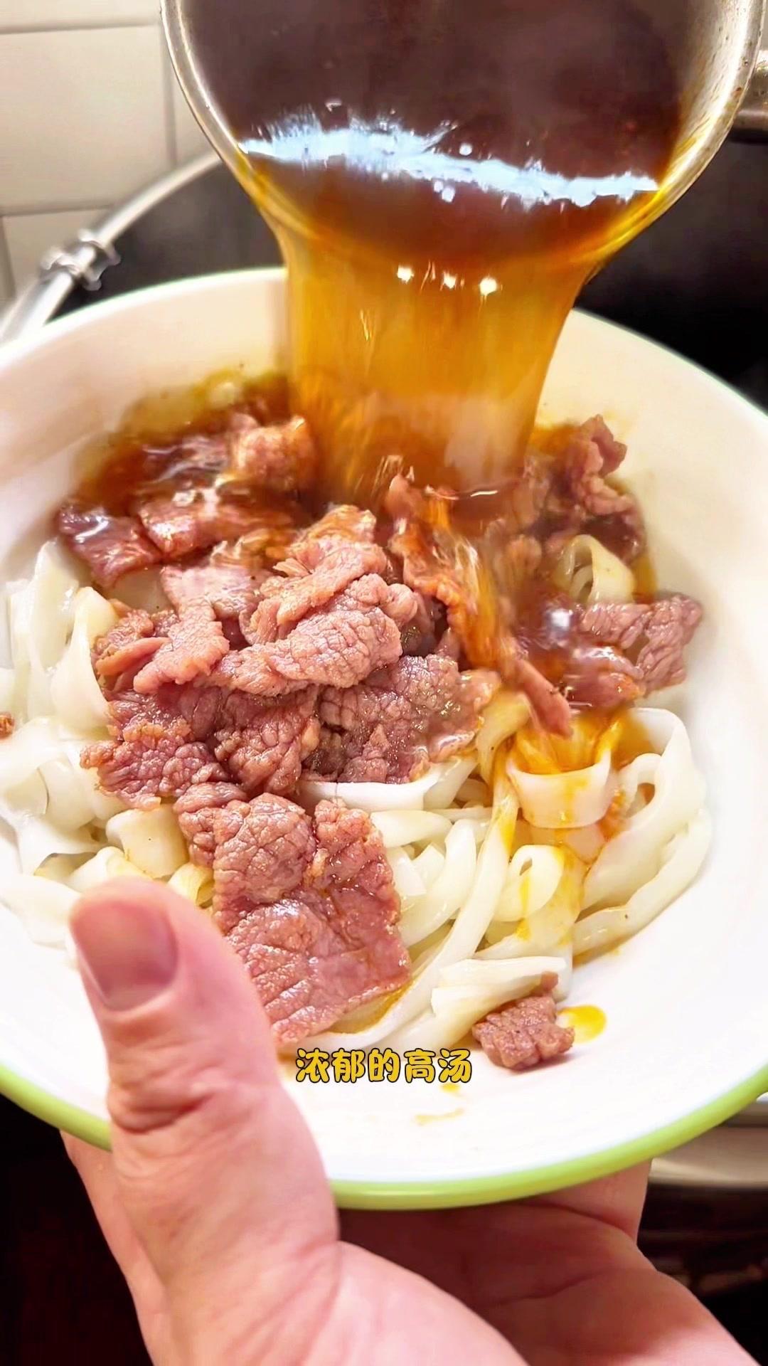 来武汉怎么少得了这样一碗生烫牛肉粉,今天来看一下我们生烫牛肉粉制作全过程。 1️⃣新鲜嫩牛肉100克,放入滚烫的高汤里面直接涮熟。牛肉的厚度只有均匀的2毫米,所以这烫的过程不允许它太持久,大概7-8秒或者10秒,牛肉已经由鲜红色变为粉嫩色。 2️⃣这边是准备好的宽粉,也是8成熟,只需要在锅里烫热烫软化就可以。3秒钟的功夫,宽粉由硬变软,就可以沥干水分倒入碗中。 3️⃣河边烫好的牛肉已等待多时,可以直接铺在碗的表面。这粉嫩的颜色应该是刚满18岁的样子,浓郁的高汤让这碗粉瞬间有了迷人的魅力,白里透着红,让人忍不住都要多看两眼。 4️⃣下面进入调味环节,榨菜、酱油、辣椒油,再给半勺浓郁的牛肉卤汤,加点海带去油腻,入味的小吃也是非常不错。来一个卤蛋,给生活加加油,这么一碗生烫牛肉粉就做好了。 如果这碗粉让你垂涎欲滴,那小菜的加入会让你流连忘返。要想生活过得去,必须带点绿,这迷人的小葱花肯定是少不了。要想味道好,调料少不了,桌子上这些小料一样加一点,吃不了亏上不了当,小料的加入让这碗粉看起来瞬间食欲大增。 用餐需注意,一定记得用嘴吃。