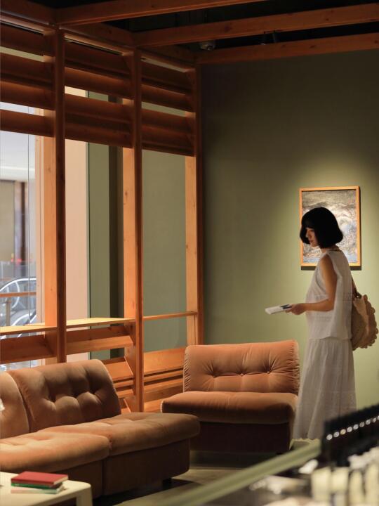 在店内一番探索后,来到角落的中古躺椅上休息,像找到了一处安静的庇护所。退到角落才发现,墙壁上的松木陈列架像极了南洋的百叶窗,围合着来访的客人,似度假小屋一般。这里何尝不是城市人在水泥钢筋里的一个庇护所呢?抬眼看到了艺术家余志毅的山水画作,在山峦起伏间,神游了片刻。