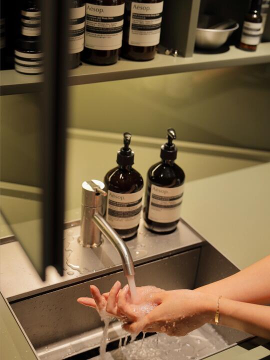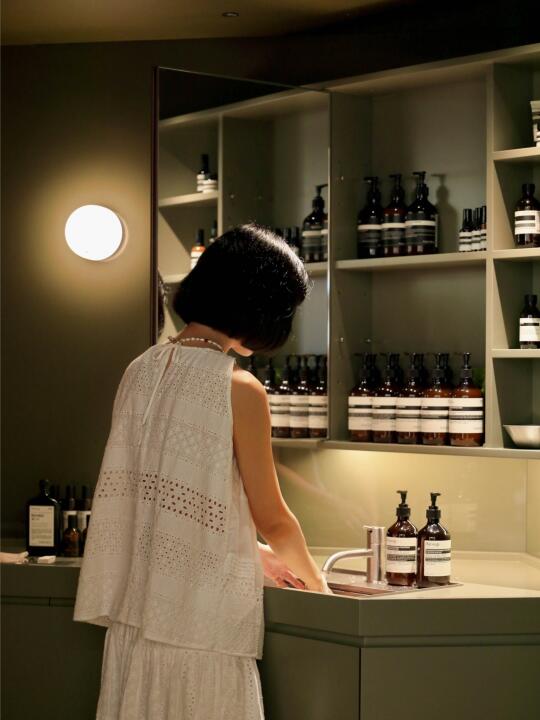 橄榄色的墙面像是季风吹来了热带的雨,匠人把它酿成涂料,抹在混凝土的缝隙中。此时,中央水槽是一汪泉,时间在流水声中也汩汩流淌。个人化水槽隐于层架后,是肌肤和灵魂都可以躲起来的私域。伊索,总能把设计写成诗。