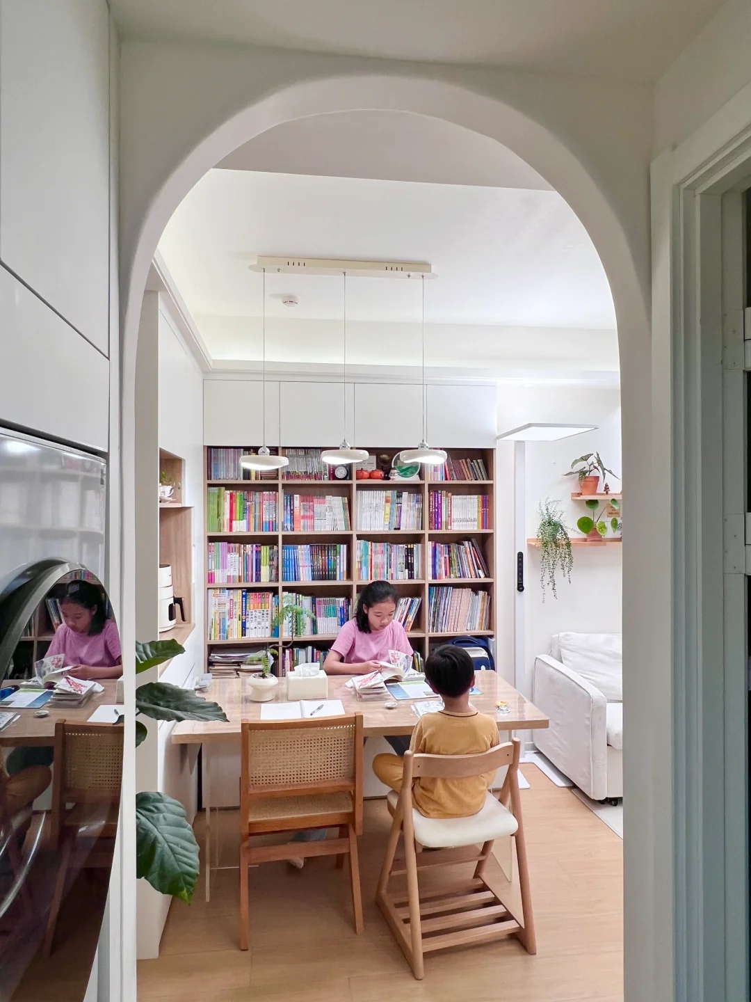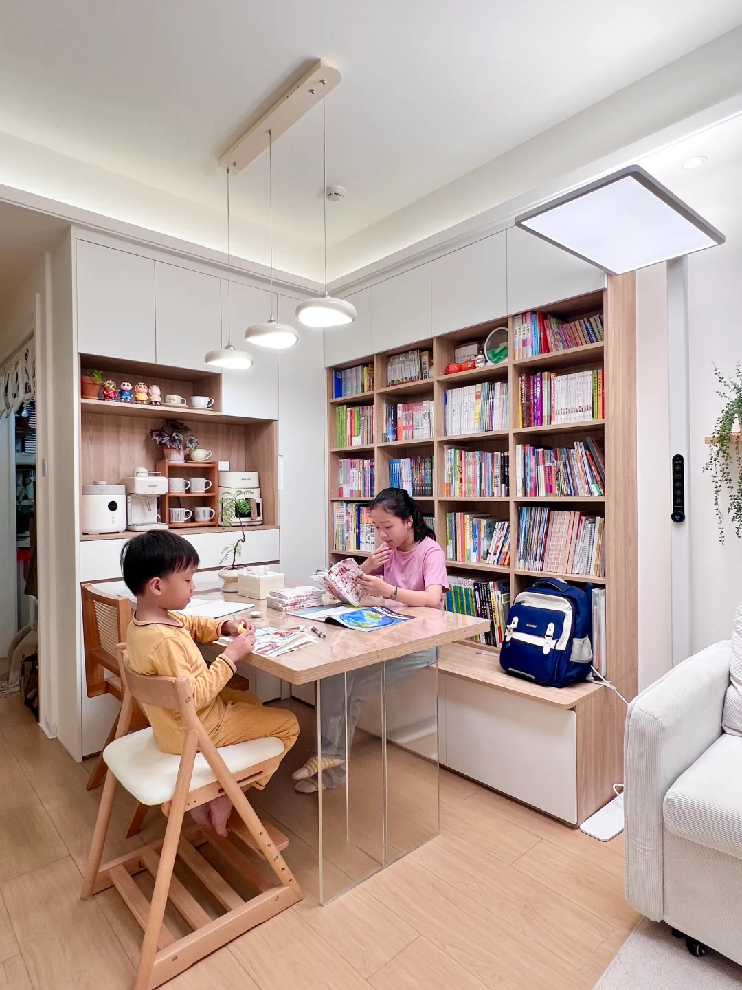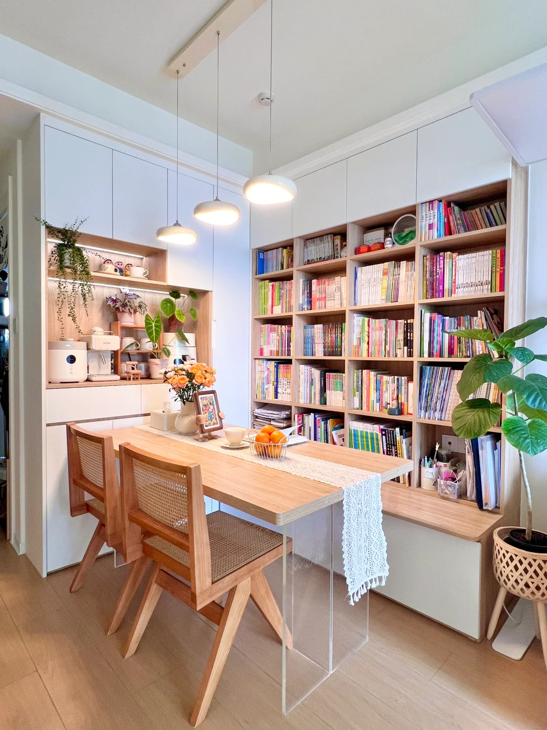 之前有设计平面图很多姐妹看不懂,现在我直接在图片标记尺寸,这样会更直观,尺寸仅供参考哈。餐边柜和书柜结合,既可以当餐桌又可以学习看书用,使用也不会冲突,吃饭的时候不写作业看书,写作业看书的时候也不会吃饭。小户型空间不够的,可以考虑这么设计哈,这个尺寸是我刷遍得出来的尺寸,即不影响开间,也不会显得压抑,书柜深度在26厘米,书柜层高做了4种不一样尺寸,满足大部分书籍的尺寸,这样的尺寸书本摆放不容易乱。