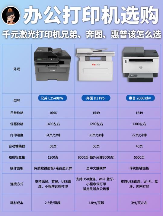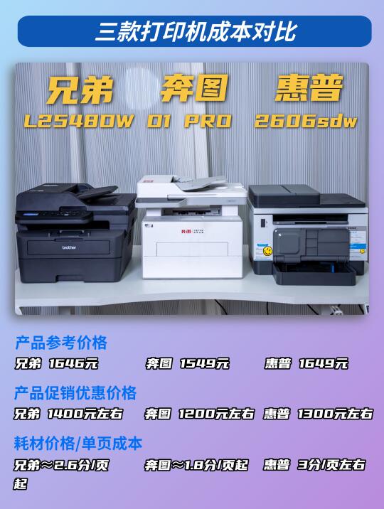进入国内四十年的传统美资大厂惠普116W、日系传统细分领域厂商兄弟L2548DW,希望对你选购帮助