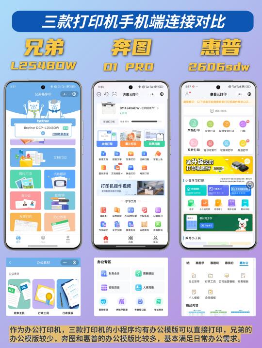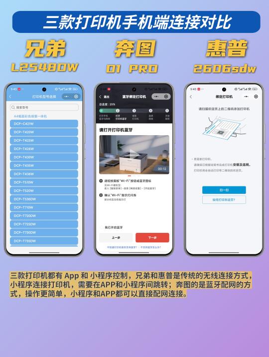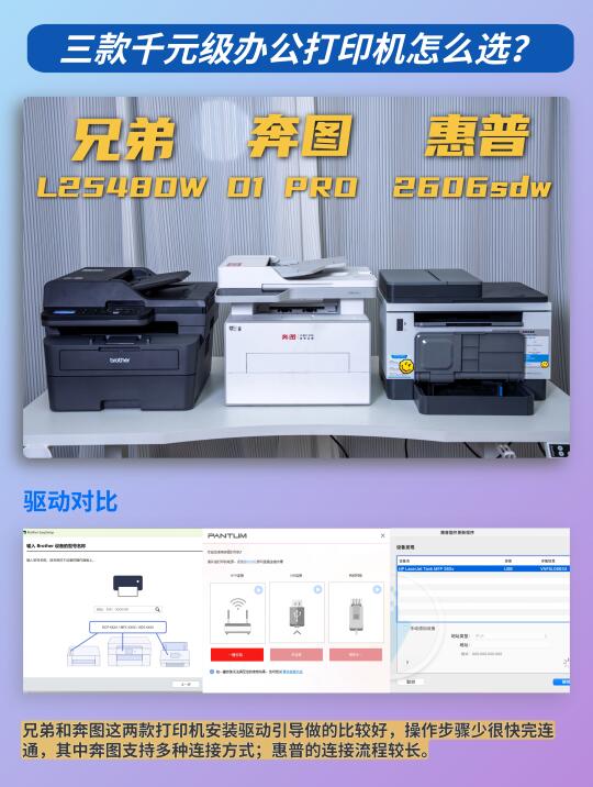 电脑端驱动安装奔图和兄弟能很快完成,奔图还有一键驱动安装新手友好,惠普页面操作需先下载应用程序驱动安装