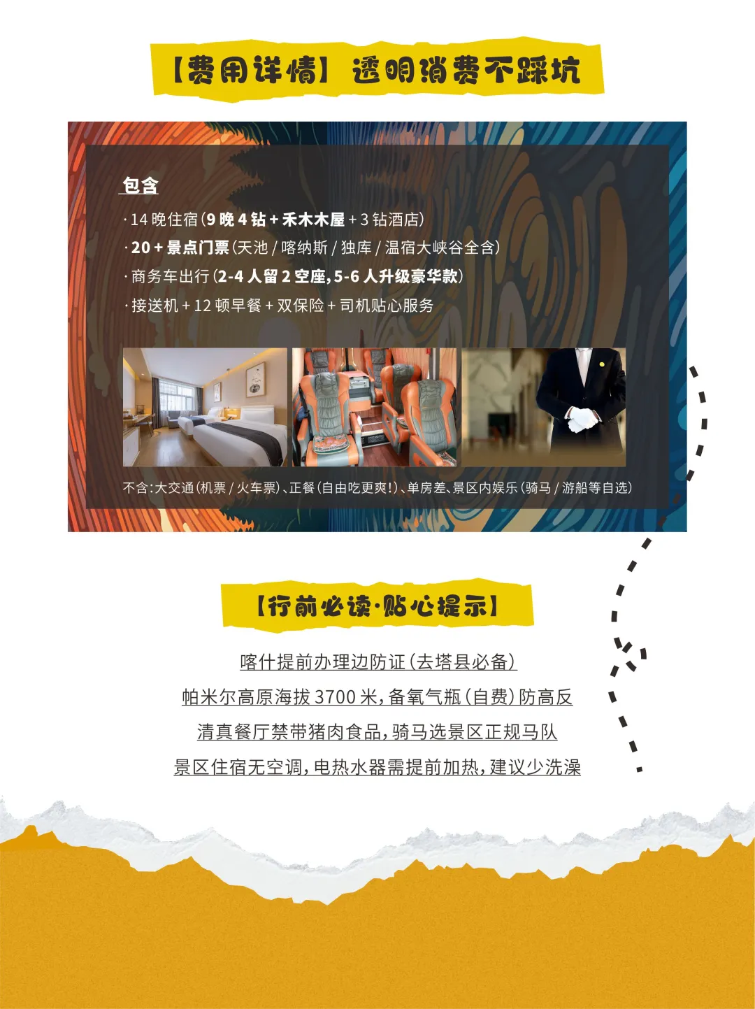 🌈家人们!新疆怎么玩最震撼?这条 15 天环线带你一次解锁南北疆地理与文明双史诗!独库全程 + 五大湖泊 + 人文秘境,跟着走不踩雷👇 ✨为什么选择这条路线? ✅ 一次打卡南北疆精华:从北疆的冰川湖泊(喀纳斯、赛里木湖)到南疆的人文古城(喀什老城),从独库公路的 “一日四季” 到帕米尔高原的 “冰川之父”,15 天解锁新疆地理与文明的双重史诗。 ✅ 小众体验拉满:入住禾木村图瓦木屋看星空🌌,探秘木吉火山口蓝冰,在塔吉克族家访喝马奶酒听鹰笛,拒绝 “打卡式” 旅行,沉浸式感受边疆风情。 ✅ 舒适与深度并存:2-4 人七座商务车(留 2 空座),5-6 人升级豪华大七座,9 晚 4 钻酒店 + 禾木木屋,行程宽松不赶路,每天留足时间拍照、发呆。 📅【行程速览】 📍D1-5:北疆仙境 乌鲁木齐集合→天山天池→禾木(住木屋,拍星空)→喀纳斯三湾→乌尔禾魔鬼城 📍D6-9:独库公路狂欢 赛里木湖环湖→独库北段(乔尔玛)→那拉提空中草原→独库中段→巴音布鲁克 📍D10-15:南疆人文与高原 库车(龟兹乐舞)→温宿大峡谷→喀什老城→白沙湖→木吉火山口→塔县(慕士塔格冰川)→盘龙古道→喀什散团 💰【费用服务指南】 ✅含 14 晚住宿(9 晚 4 钻 + 禾木木屋)、20 + 景点门票、商务车接送机、12早餐、双保险 ❌不含大交通 / 中晚餐 / 单房差/ 景区娱乐 ✨ 4 人起可随时成团,5-10 月多团期可选 ✨老年证 / 学生证等优惠证件门票现退(需提前出示) 💡【行前必备 Tips】 🧳📜行李清单 📄证件:身份证、边防证(喀什提前办理,去塔县用) 👗衣物:冲锋衣(山区温差大)、长裙(赛里木湖 / 禾木拍照)、运动鞋(老城 / 峡谷徒步) ☀️其他:防晒霜(SPF50+)、墨镜、晕车贴(盘山路多)、便携氧气瓶(帕米尔高原自费备) 📌禁忌:清真餐厅禁止携带猪肉食品,骑马需选择景区正规马队并听从马夫指导 🌊这不是旅行,是把新疆的万种风情揉进15天的史诗冒险 当禾木晨雾漫过木栈道,当独库公路的雪线掠过车窗,当喀什老城的砖雕映着夕阳 —— 你会明白,为什么说 “不到新疆,不知中国之美”。 👇 点击头像私信 “新疆” 获取详细行程 ! 或评论区留言 “报团”,专属管家一对一解答,带你解锁边疆浪漫! 新疆旅行攻略 新疆享自由旅行社 新疆旅游 2到6人小团 南北疆 喀什 赛里木湖 那拉提