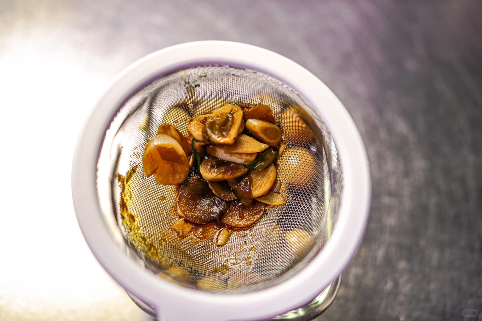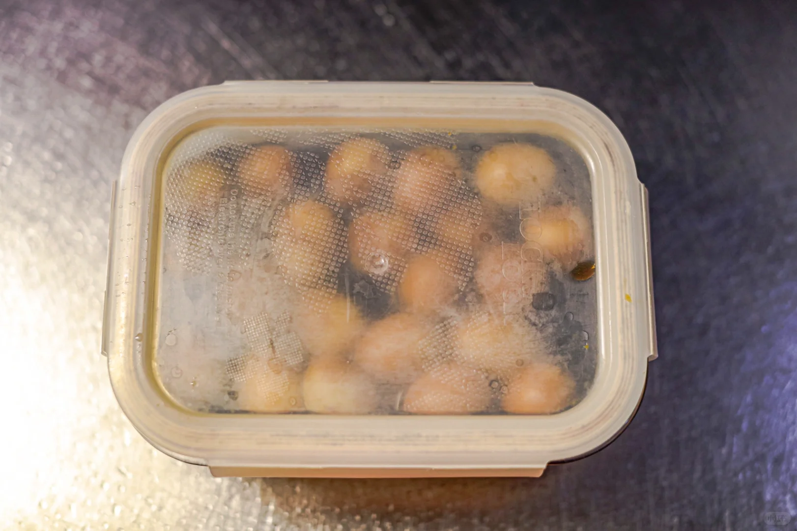 6.鹌鹑蛋放入保鲜盒中,过滤掉汤汁中的料渣,凉透以后放入冰箱随吃随取。