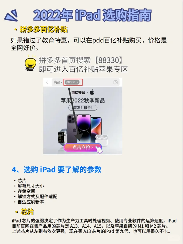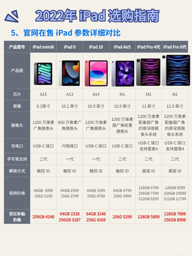3⃣️目前官网在售 iPad 详细参数及价格对比请看图 7,百亿补贴优惠价格已标注出来!