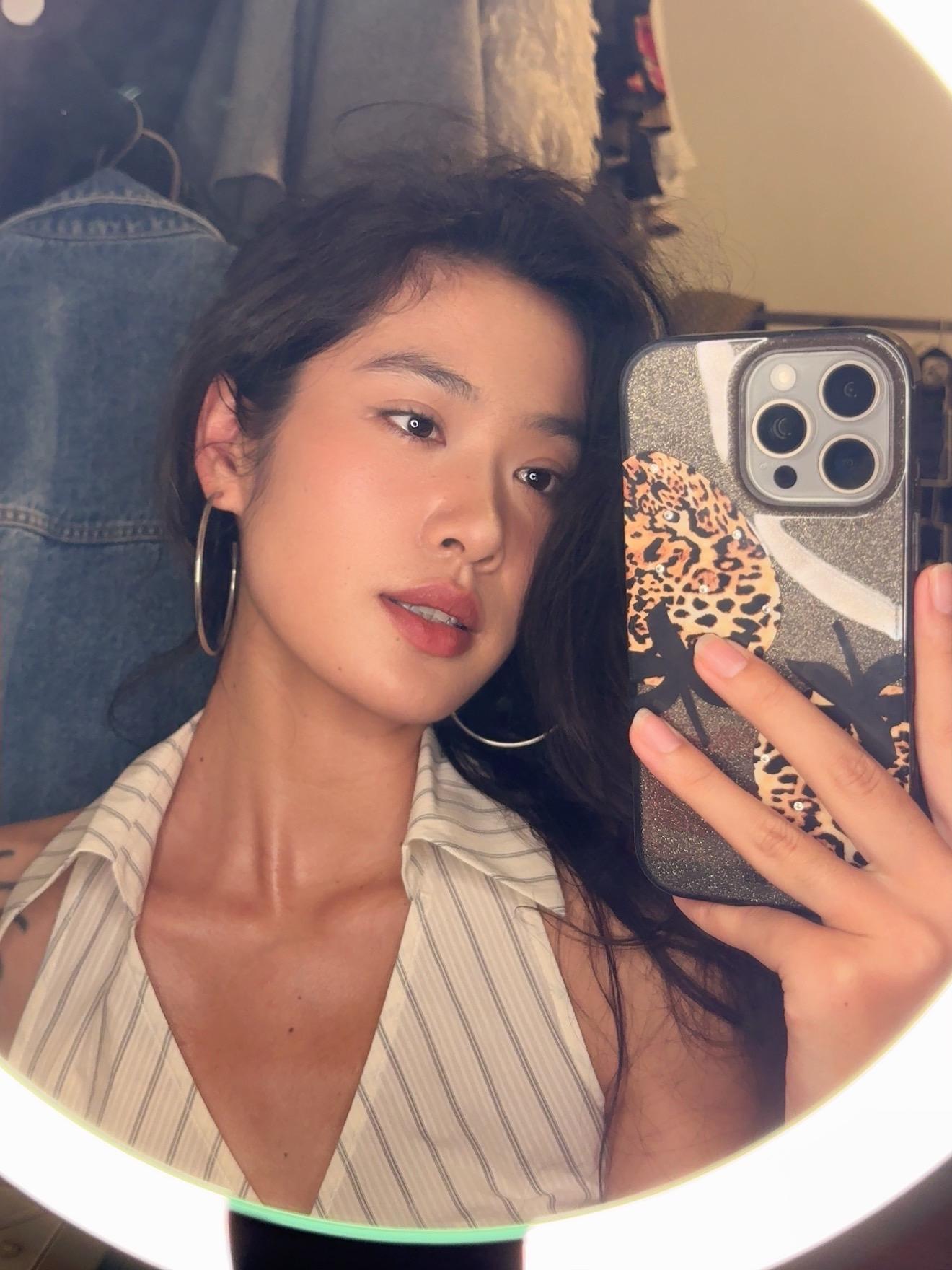 她一袭粉色褶皱吊带裙,后背系带设计别致,搭配金属链条装饰的高跟鞋,优雅又时尚,是