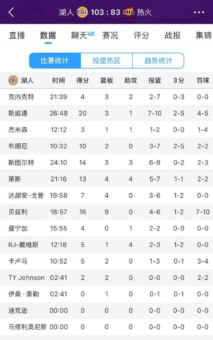 湖人在比赛中火力全开,以103-83大胜热火。此役斯威德状态火热,10投7中高效砍下20分3篮板;布朗尼延续良好手感,拿下10分2篮板。贝兹利攻防俱佳,贡献16分9篮板,成为内线支柱。尽管克内克特7投2中仅得4分,但也有3篮板2助攻入账。湖人众将多点开花,凭借出色发挥,轻松赢下这场关键胜利。#湖人# #nba 湖人#