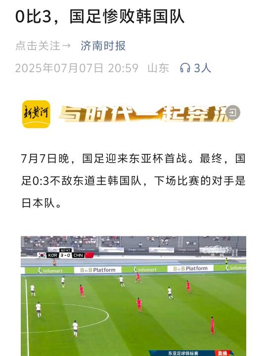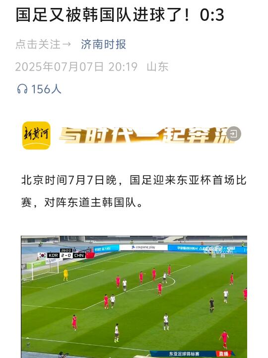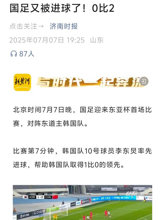 🔥7月7日19:00,2025韩国第10届东亚杯揭幕战,韩国与中国的比赛,在韩国龙仁龙体育场进行。最终,中国0-3失利。第8、21、57分钟,李东炅、朱玟奎、金朱晟先后破门。