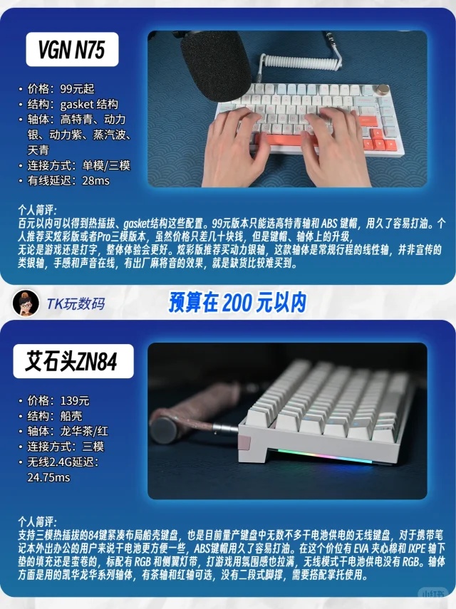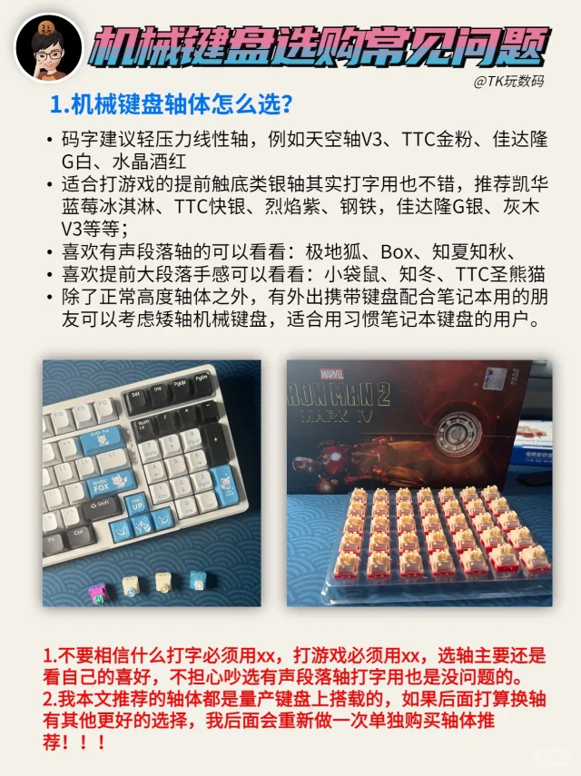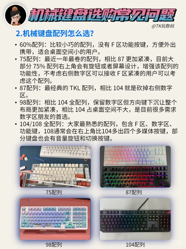 大家好,这里是 选前要确定下如何选轴体和配列,具体请看图2~3。 12款高性价比机械键键盘推荐清单请看图4~9.