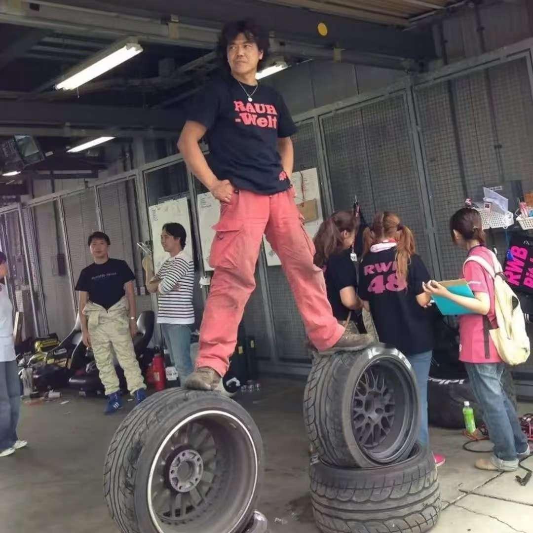 在维修区,穿粉裤的改装大师叉腰稳站轮胎上↑