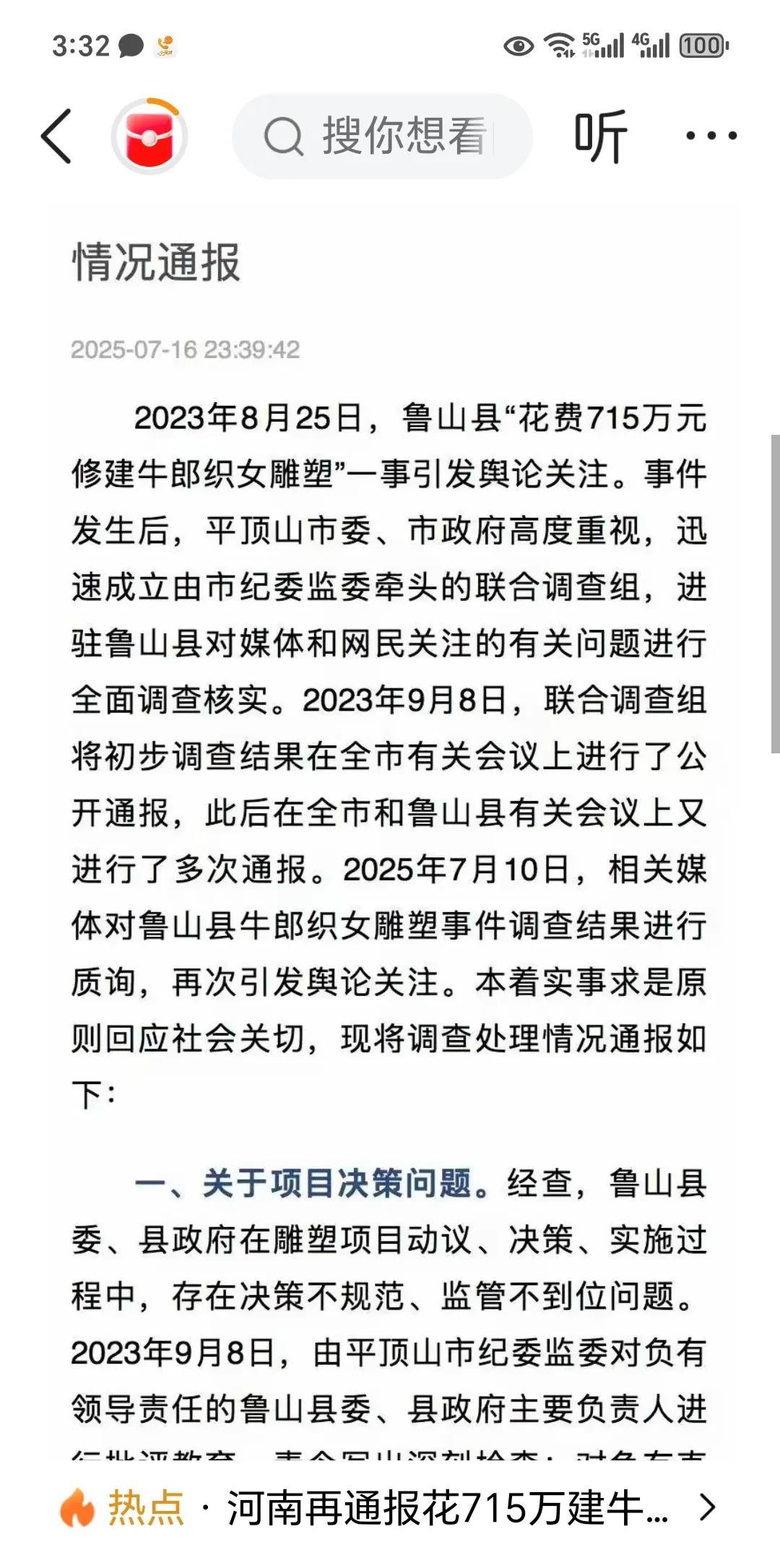 被逼出来的《通报》,7月12日,有主流媒体致电平顶山市的多个有关部门,询问鲁山县花费700多万修建牛郎织女雕塑,且调查两年为何毫无结果一事,然而均无得到回应。同日,该媒体又向该市纪检部门求证,得到的答复是事情正在调查之中,其问题不方便说,属于保密内容。 仅仅四天之后,也就是在7月16日深夜将近12点时,平顶山市突然发布出《情况通报》,原来这个事情早在5个月前就已经处理完毕,只是没对外公开而已。 《通报》为什么姗姗来迟,个中原因就不得而知了。