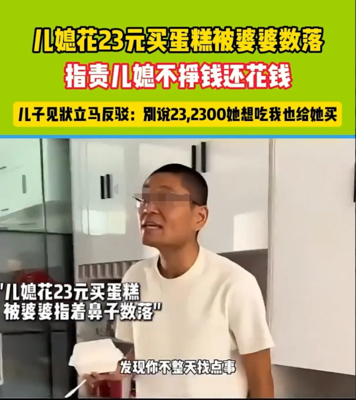 河南,女子买了23元的蛋糕,被婆婆指责不挣钱、只花钱,儿子却反驳道:“别说23元,就是2300元我也给她买。”随后拉着女子到卧室去享用蛋糕了。