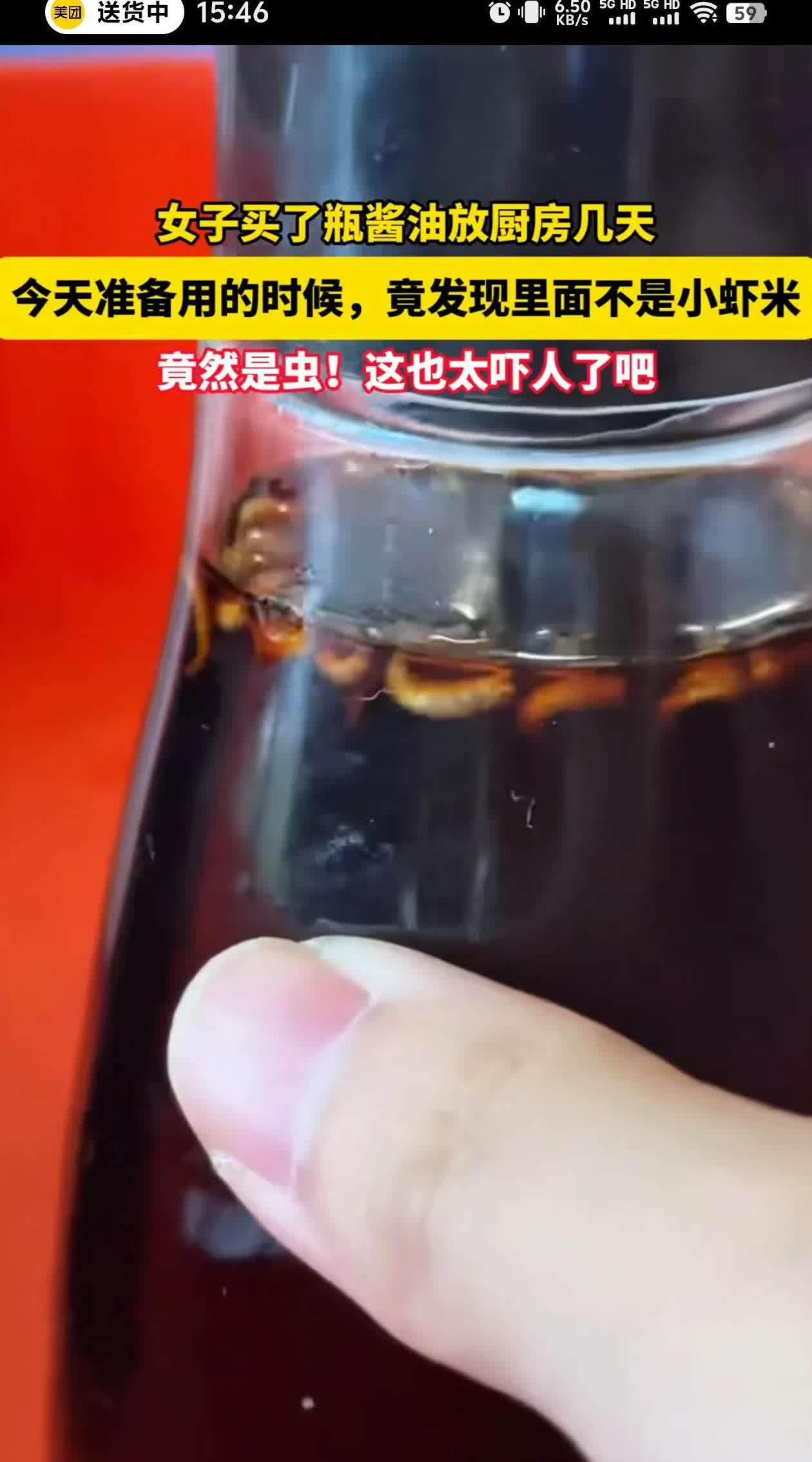 一女子买了一瓶酱油,放在厨房几天后一天她做饭正好要用到酱油,结果发现酱油里面生了