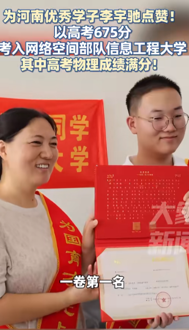 “谁说寒门出不了贵子?”河南民权,一农村男孩以675分的高考成绩,成功考入网络空间部队信息工程大学,而且还在录取的考生中排到第一名!当问到孩子为什么如此优秀时,他妈妈激动地说:“从小学一年级开始,家里就没有电视,唯一的手机是用来当闹钟的老年机,而且满屋的书籍堆得比人还高,用过的笔都是成袋装的!”网友直呼:“这才是真正的榜样!” 据大象新闻7月17日报道:河南民权县出了件让人高兴的事儿,让不少家长的心跟着热乎起来。 18岁的李宇驰,这个地地道道的农家娃,今年高考考出了675分的好成绩,物理更是拿了满分。 这分数搁哪儿都是拔尖的,更难得的是,他考上的是中央军委直属的网络空间部队信息工程大学,还是今年该校在全国一卷考生里录取的最高分。 这孩子有啥特别的?说出来你可能不太信。他家,从李宇驰上小学一年级起,就没摆过电视机,唯一能算得上电子产品的,是一部只能打电话、当闹钟用的老年机。 家里的空间,几乎都被书占满了,各种各样的书,一层叠一层,堆得比人还高,再看他用过的笔芯,那可不是一根两根,是用袋子装起来的。 还有个细节挺让人意外,李宇驰近视200度,以前不少人觉得眼睛近视就断了进军校的路。 事实并非如此,军校不同专业对视力的要求有差别。像李宇驰考上的这个专业,体检标准明确写着:裸眼视力不低于4.5,戴上眼镜后矫正视力能达到4.8就行,他的视力完全符合要求,打破了“近视无缘军校”的旧印象。 这事儿传到网上,一下子引来好多围观。很多网友是真心佩服。有人感叹:“现在能有几个孩子离得开手机电视?这家长真有定力,从小就给隔绝了诱惑,太不容易了!” 还有不少网友直呼“震撼”:“看看人家孩子这功夫下的,光用完的笔芯就那么多袋,咱家的用完十根都难。成绩背后是真付出啊!” 李宇驰的故事,没有惊天动地的戏剧性,就是日复一日的坚持。家里那台安静的老旧手机,满屋子沉默的书本,还有那一袋袋写秃的笔芯,就是他通往成功的阶梯。 它实实在在地告诉人们,在这个满是诱惑的时代,屏蔽干扰、专注目标,依然是最朴素的成功法则。 孩子的未来,既需要父母的引导和坚持,更需要自身那份坐得住冷板凳的毅力和对知识的渴望。 李宇驰用行动证明,成功的路,未必需要多么华丽的装备,一颗沉得下来的心和日积月累的汗水,足够有力。 对此,大家有什么看法?您是不是也被李宇驰的奋斗之路感动了?在评论区谈谈您的看法。