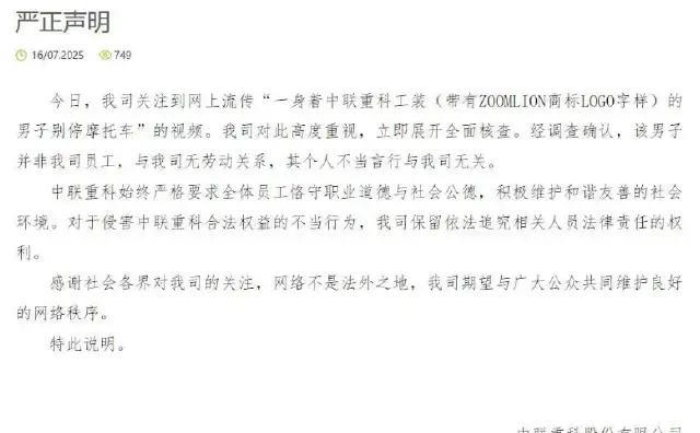 山东,一名男子驾车行驶在路上,连续变道险撞摩托车,下车后态度嚣张扬言要“弄死你”。伴随着唾沫星子,手指指着摩托车车主,说出十分难以入耳的话,其身上穿着印有中联重科的工装,有人怀疑是否是公司的员工。中联重工表示:此人并非我司员工。 据杭州网7月17日报道,山东济南一名男子在城市道路上驾车时连续变道,险些酿造车祸。下车之后对着摩托车主进行辱骂,并且威胁摩托车车主,言辞不堪入耳。当时这名男子身着工装,上面印着中联重科的标识,但是事后这家企业赶紧发表声明,这个人跟我们公司没有劳动关系,他并非我们公司员工。 这个新闻一出来,网友看着看着,不禁心里都打寒战:这还是和谐社会吗?简直就像是黑社会。我们还原一下视频发生的事情。 在道路上,一辆黑色汽车连续变道,此举已经涉及危险驾驶。然后驾驶司机不按照引流导线行驶,差点就撞到隔壁车道的摩托车车主。 只见这位驾驶员,不管三七二十一,下车之后就劈头盖脸的对着摩托车车主一顿狂骂。估计他不知道摩托车车主也是有车载视频的,他的每一句脏话,全都记录在视频里。 接着,这位驾驶员又开始面露凶色,喷着唾沫星子,手指着摩托车车主,不仅辱骂,说尽了脏话,甚至还说出要威胁摩托车车主性命的话语。简直就是一个黑社会啊。 吓得摩托车车主,赶紧连声道歉:不好意思不好意思!网友都说,明明就是摩托车车主犯错了,现在反而轮到摩托车车主道歉,这是什么个事儿! 细心的网友发现,这个面露凶狠之色的男子,他的身上穿了一件工作服,上面就印有中联重科的标记。很多网友表示,这个人是不是就是在这家公司上班呢,是不是就是中联重科的工作人员呢? 事后,中联重科迅速展开了调查,经过全面核查之后,发出了严正声明。中联重科表示,这名男子并非是我们公司的员工,跟我们公司也没有签订劳动关系。他的不当言行跟我们公司没有任何关系。 目前,该案子还在进一步调查中,中联重科表示,网络上存在侵害中联重科合法权益的不当行为,公司将会保留追究相关人员的法律责任的权利。我们期待该案件的进一步调查结果。 摩托车车主在行路过程中,如果碰到这样的情况,对方声称撞到你,你活该。如果真的被撞,就真的活该了吗,真的就没法维护自己的合法权益了吗? 1.机动车在驾驶过程中,如果连续变道,此行为违法吗? 根据《道路交通安全法》规定,车辆在行驶过程中,不可以一次连续变更两条以及以上的机动车道,否则将会构成违法。在城市地面道路违法,会被扣3分,罚款20-200元。 从本案来看,这位黑色车车主,其驾驶车辆是连续变道,由于连续变道会干扰到多个车道内车辆的正常行驶,妨碍到后方车辆的行驶,也会增加交通事故的风险。本案中的车主连续变道行为已经涉嫌违法,将会面临处罚和追责。 2.如果遇到人对自己进行人身攻击、辱骂,且扬言要弄死自己,该怎么替自己维权呢? 根据《刑法》第293条规定,随意对他人进行辱骂、人身攻击,属于违法行为,会被判定为寻衅滋事罪。 根据《治安管理处罚法》规定,如果对方对自己进行人身攻击、辱骂,并且扬言要弄死自己,这种行为涉嫌威胁他人人身安全,会被处以5-10日拘留,且处以500元以下罚款;如果公然侮辱他人,最高可以处以10日拘留且罚款500元。 从本案来看,这位黑色汽车的车主,下车第一件事就是对摩托车车主进行辱骂,并且脏话连篇让人无法入耳。这种行为属于对他人进行辱骂的行为,已经涉嫌违法。 另外,在黑色汽车司机下车之后,跟摩托车车主说会弄死他,该言论涉嫌威胁他人的人身安全,已经违反了治安管理法的相关规定,将会受到责罚。后期摩托车车主可以报警处理,甚至可以诉讼法律,依法维护自己的合法权益。 这件事还在持续发酵,很多网友表示,和谐社会,黑色车车主的这些言行举止,实在是令人害怕、心生畏惧。 如果您在路上遇到这样的情况,会选择主动道歉吗?欢迎大家到评论区里来讨论讨论。#记录我的2025#