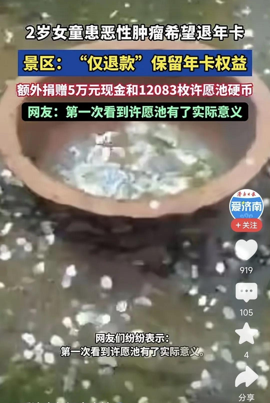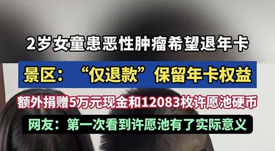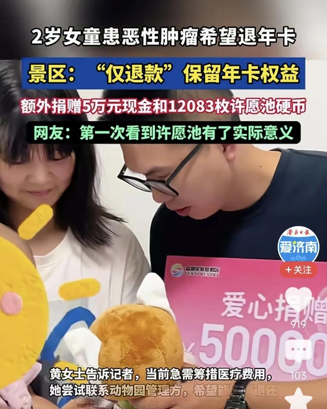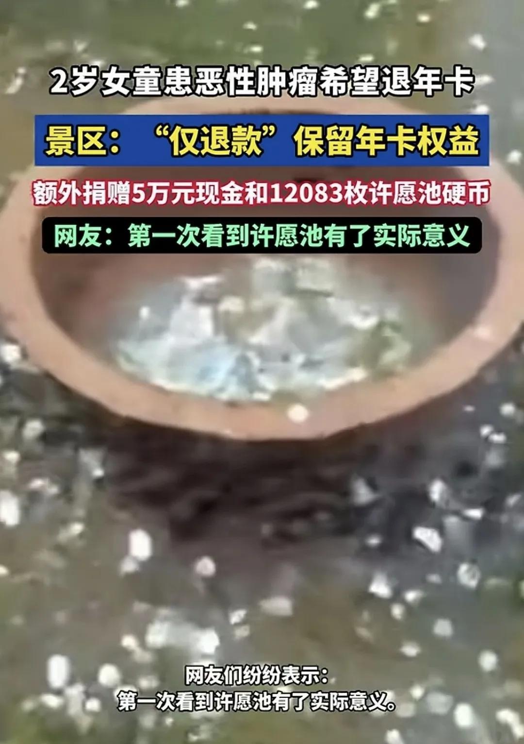 今天,很多网友被这一则消息感动了。南通森林野生动物园,我记住了这一个景点,下次带孩子去南通一定会带孩子去打卡。虽然还没有去,但已经让所有网友感觉到了,这是一家有温度的景点。 一位两岁的女孩不幸患上了恶性肿瘤,孩子的母亲希望退掉动物园的年卡。而动物园在了解到孩子的情况之后,快速帮孩子退掉了年卡但同时保留了年卡的权益,这已经是一件善举了。但事情还没有结束,这家动物园额外捐款5万元和12083元许愿池的硬币。很多网友感慨,许愿池的硬币用到了最该用的地方,这也是很多善良的人的共同愿望。不少网友表示,下次去南通要去这家动物园打卡,要去许愿池许愿,希望这个两岁的女童能得到最好的医治,能尽快康复。 善良是人世间一道光,可以照亮很多人的前行之路。